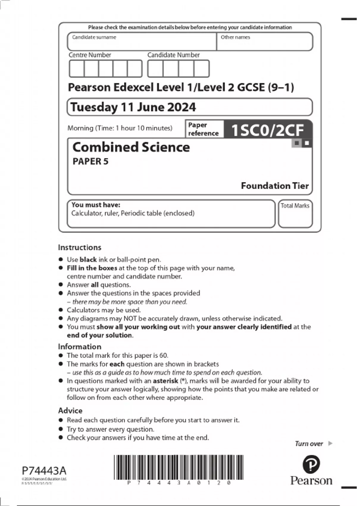 2024 GCSE Pearson Edexcel Level 1/Level 2 GCSE (9–1) Combined Science PAPER 5 Foundation Tier Combined Question paper with Marking Scheme