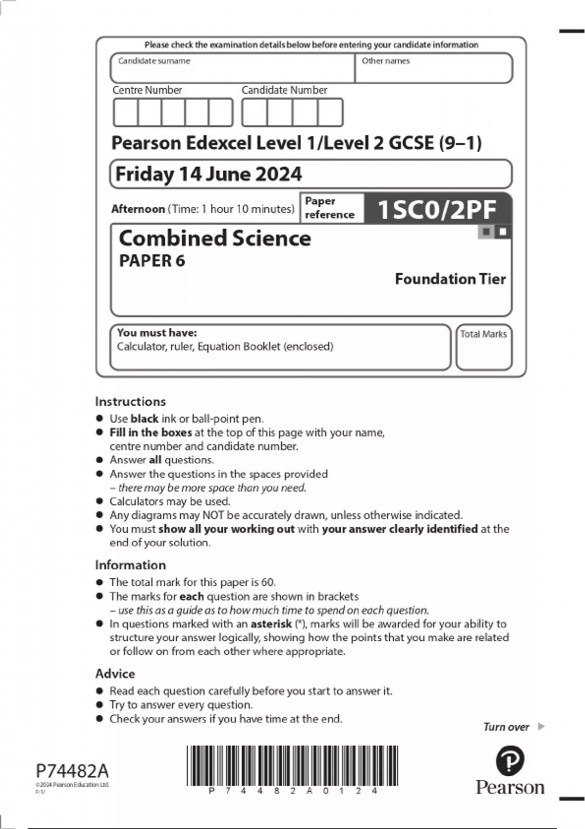 2024 GCSE Pearson Edexcel Level 1/Level 2 GCSE (9–1) Combined Science PAPER 6 Foundation Tier Combined Question paper with Marking Scheme