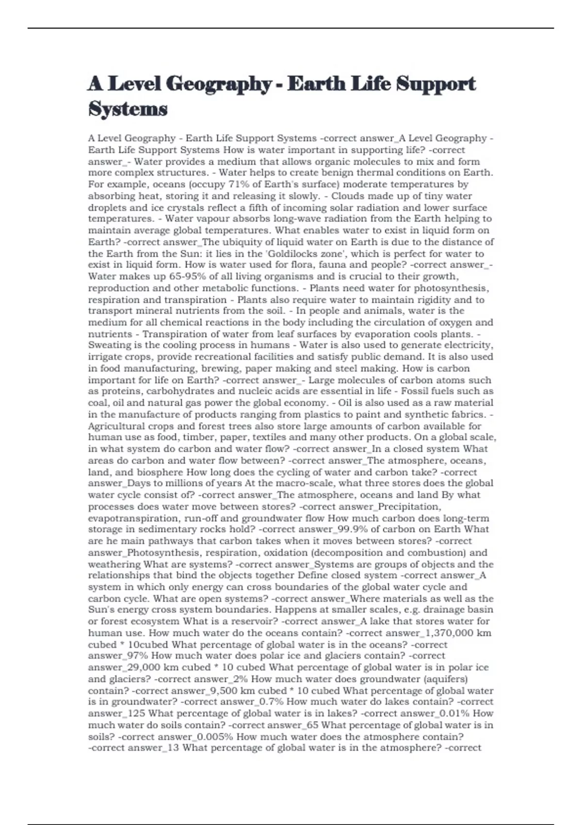 A Level Geography - Earth Life Support Systems -correct answer_A Level Geography -