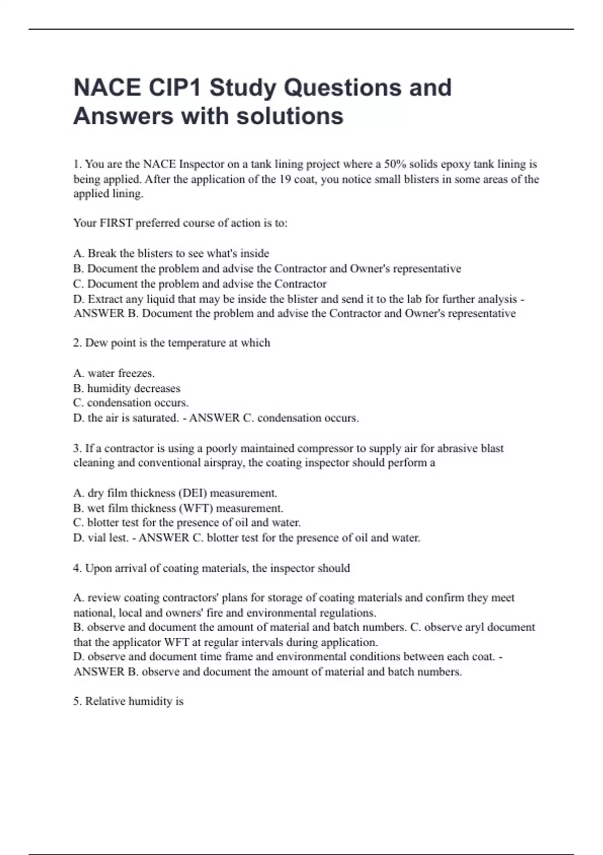 1. You are the NACE Inspector on a tank lining project where a 50% solids epoxy tank lining is