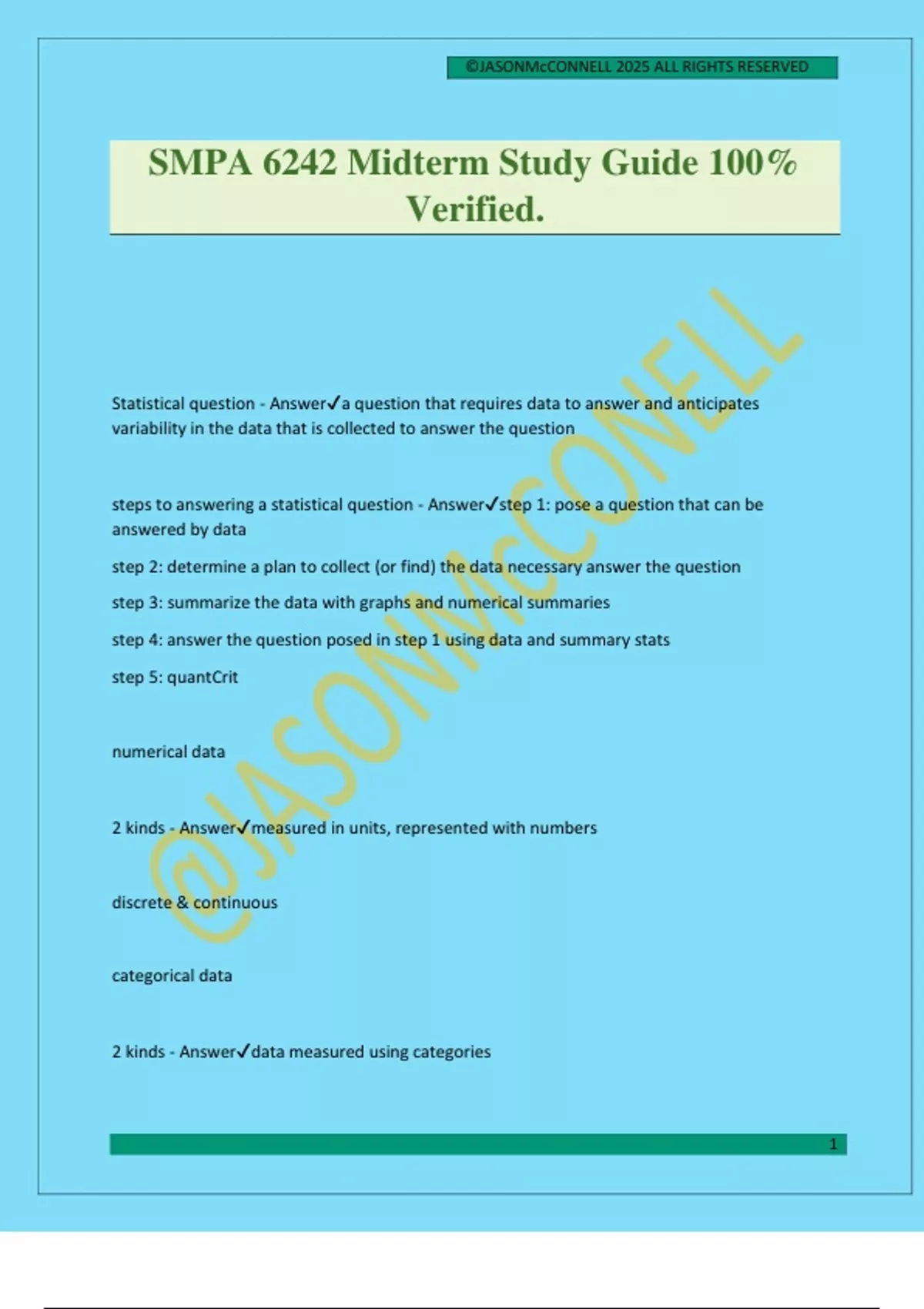 ©JASONMcCONNELL 2025 ALL RIGHTS RESERVED 1 SMPA 6242 Midterm Study Guide 100% Verified. Statistical question - Answera question that requires data to answer and anticipates variability in the data that is collected to answer the question steps to answering a statistical question - Answerstep 1: pose a question that can be answered by data step 2: determine a plan to collect (or find) the data necessary answer the question step 3: summarize the data with graphs and numerical summaries step 4: answer the question posed in step 1 using data and summary stats step 5: quantCrit numerical data 2 kinds - Answermeasured in units, represented with numbers discrete & continuous categorical data 2 kinds - Answerdata measured using categories
