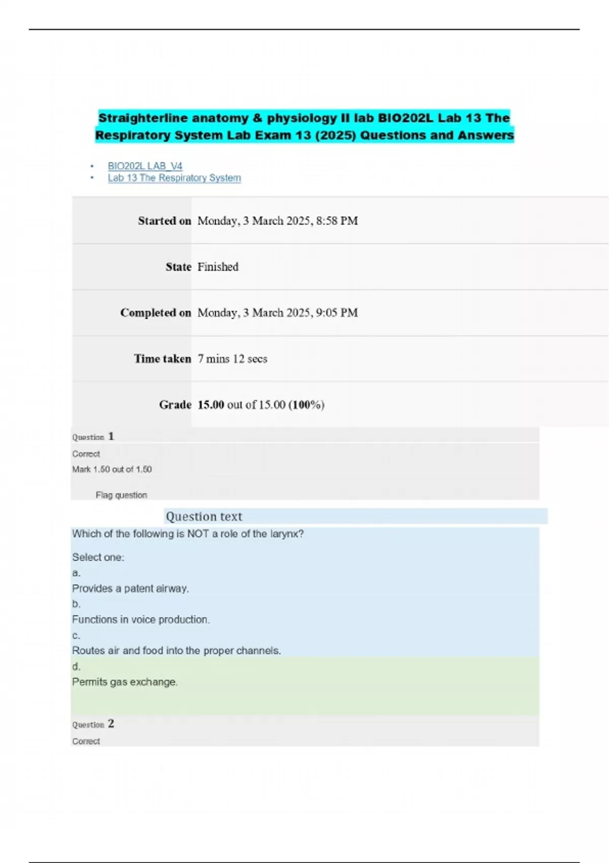 Straighterline anatomy & physiology II lab BIO202L Lab 13 The Respiratory System Lab Exam 13 (2025) Questions and Answers
