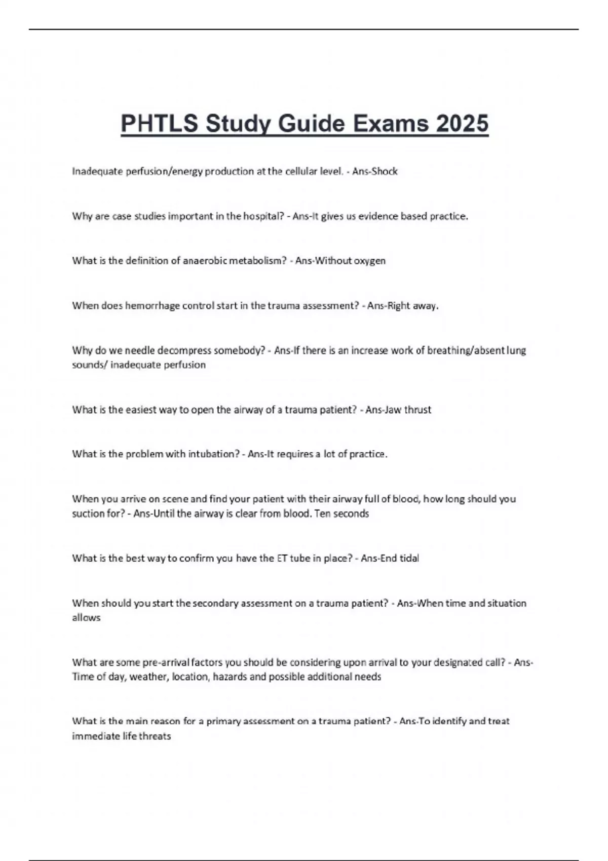 Inadequate perfusion/energy production at the cellular level. - Ans-Shock Why are case studies important in the hospital? - Ans-It gives us evidence based practice. What is the definition of anaerobic metabolism? - Ans-Without oxygen When does hemorrhage control start in the trauma assessment? - Ans-Right away. Why do we needle decompress somebody? - Ans-If there is an increase work of breathing/absent lung sounds/ inadequate perfusion What is the easiest way to open the airway of a trauma patient? - Ans-Jaw thrust What is the problem with intubation? -Ans....