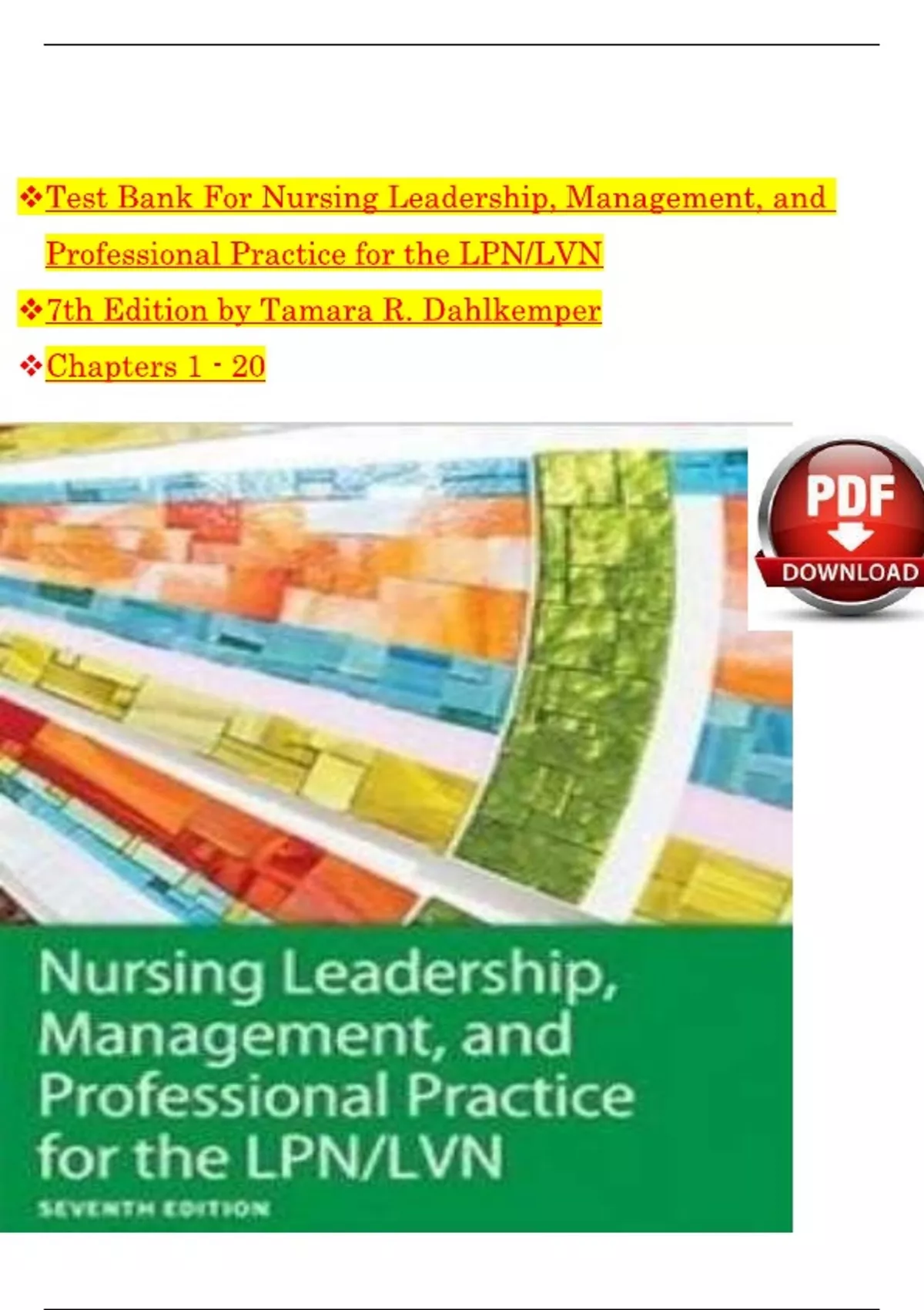 Test Bank For Nursing Leadership, Management, and Professional Practice for the LPN/LVN, 7th Edition by Tamara R. Dahlkemper, All Chapters 1-21 LATEST