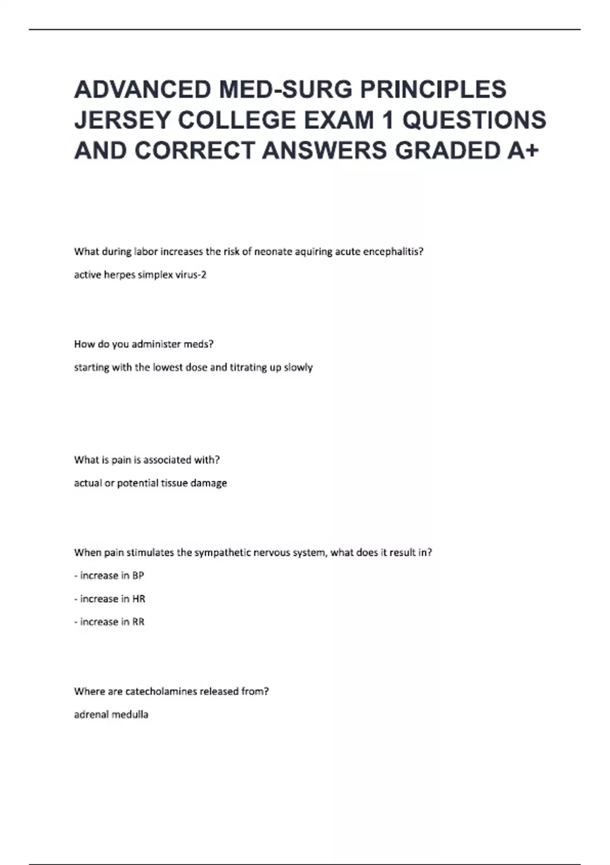ADVANCED MED-SURG PRINCIPLES JERSEY COLLEGE EXAM 1 (Latest 2025 / 2026 Update) Questions and Verified Answers| 100% Correct | Grade A+.