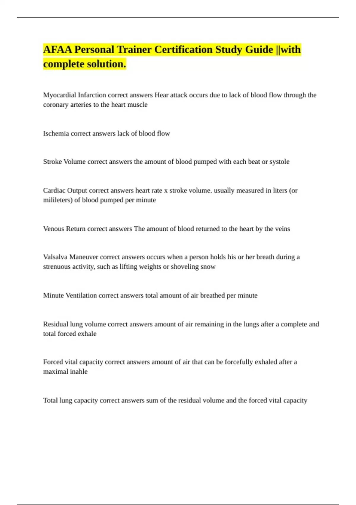 Myocardial Infarction correct answers Hear attack occurs due to lack of blood flow through the coronary arteries to the heart muscle Ischemia correct answers lack of blood flow Stroke Volume correct answers the amount of blood pumped with each beat or systole Cardiac Output correct answers heart rate x stroke volume. usually measured in liters (or milileters) of blood pumped per minute Venous Return correct answers The amount of blood returned to the heart by the veins Valsalva Maneuver correct answers occurs when a person holds his or her breath during a strenuous activity, such as lifting weights or shoveling snow Minute Ventilation correct answers total amount of air breathed per minute Residual lung volume correct answers amount of air remaining in the lungs after a complete and total forced exhale Forced vital capacity correct answers amount of air that can be forcefully exhaled after a maximal inahle Total lung capacity correct answers sum of the residual volume and the forced vital capacity