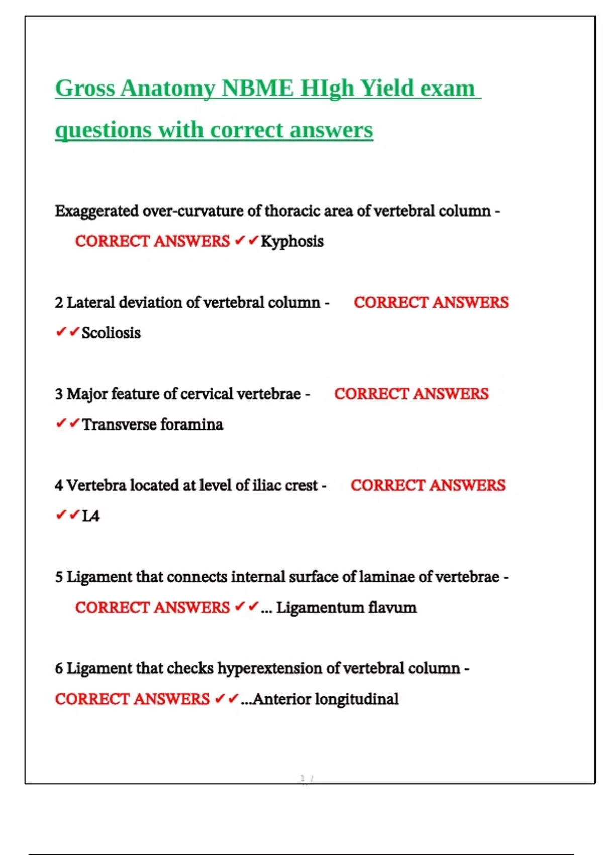 Gross Anatomy NBME HIgh Yield exam questions with correct answers