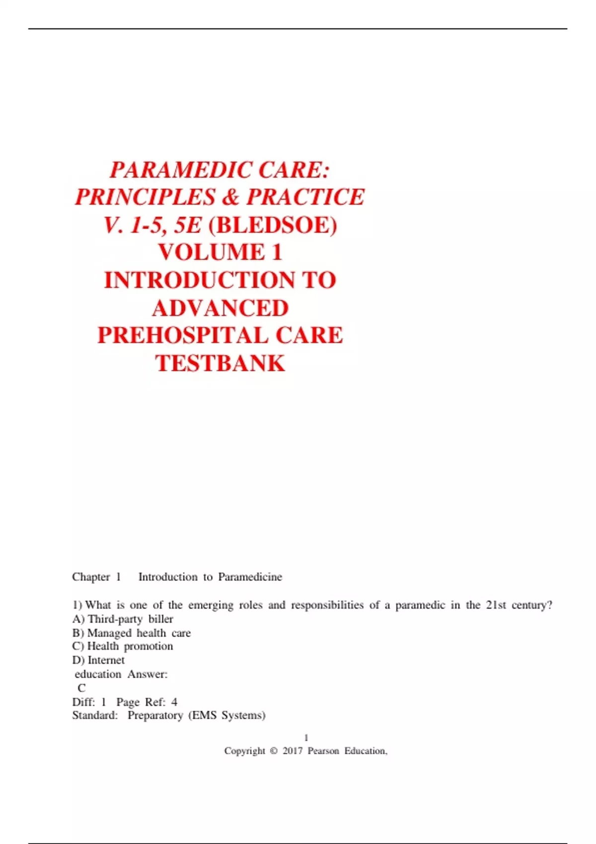 PARAMEDIC CARE: PRINCIPLES & PRACTICE V. 1-5, 5E (BLEDSOE) VOLUME 1 INTRODUCTION TO ADVANCED PREHOSPITAL CARE TESTBANK