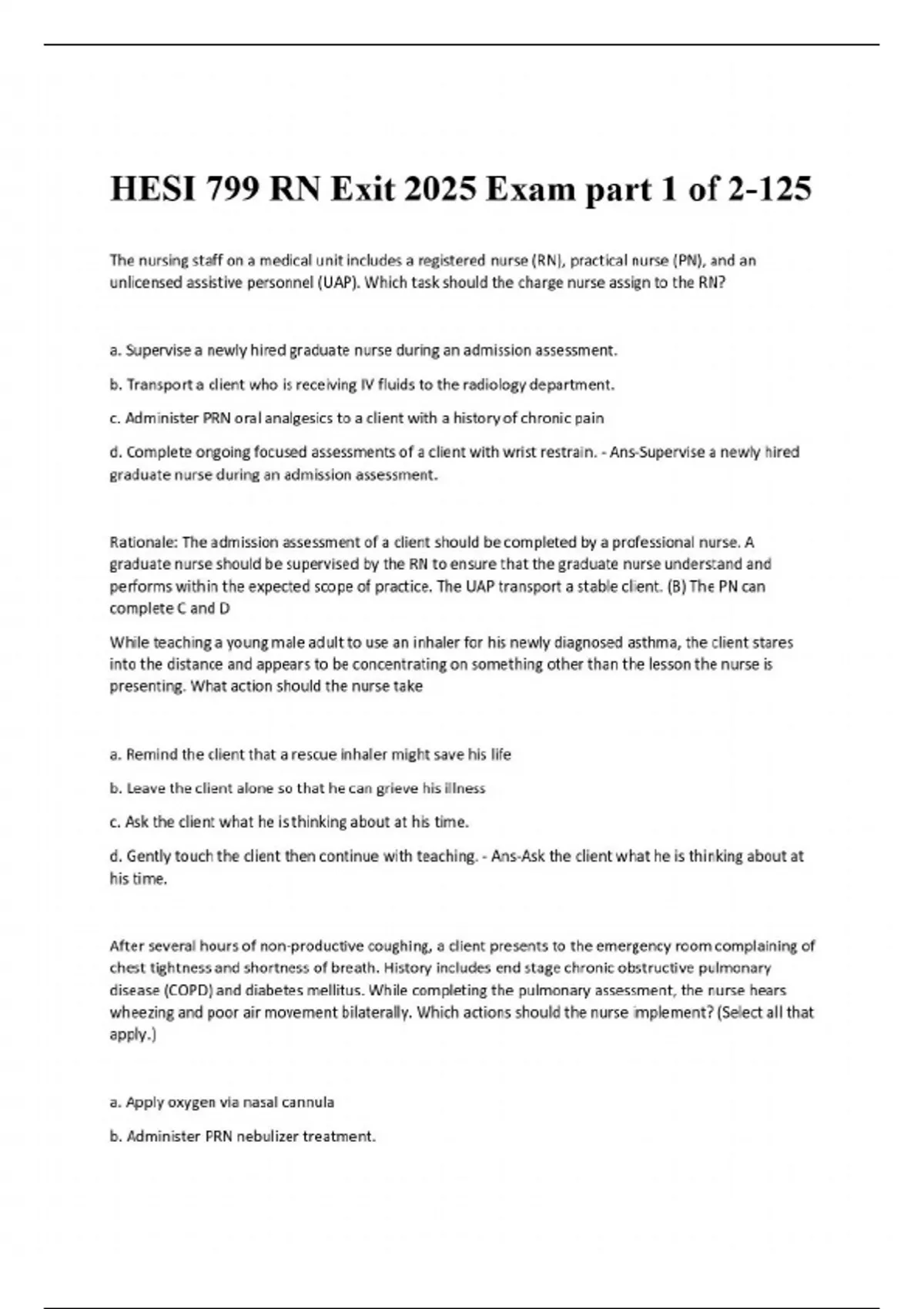 The nursing staff on a medical unit includes a registered nurse (RN), practical nurse (PN), and an unlicensed assistive personnel (UAP). Which task should the charge nurse assign to the RN? a. Supervise a newly hired graduate nurse during an admission assessment. b. Transport a client who is receiving IV fluids to the radiology department. c. Administer PRN oral analgesics to a client with a history of chronic pain d. Complete ongoing focused assessments of a client with wrist restrain. - Ans-Supervise a newly hired graduate nurse during an admission assessment. Rationale: The admission assessment of a client should be completed by a professional nurse. A graduate nurse should be supervised by the RN to ensure that the graduate nurse understand and performs within the expected scope of practice. The UAP transport a stable client. (B) The PN can complete C and D While teaching a young male adult to use an inhaler for his newly diagnosed asthma, the client stares into the distance and appears to be concentrating on something other than the lesson the nurse is presenting. What action should the nurse take...........