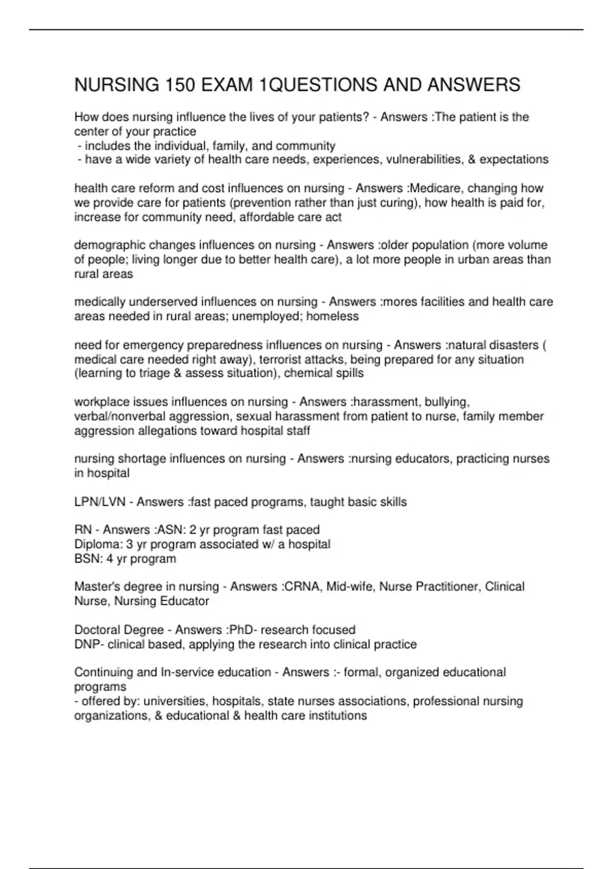 NURSING 150 EXAM 1QUESTIONS AND ANSWERS