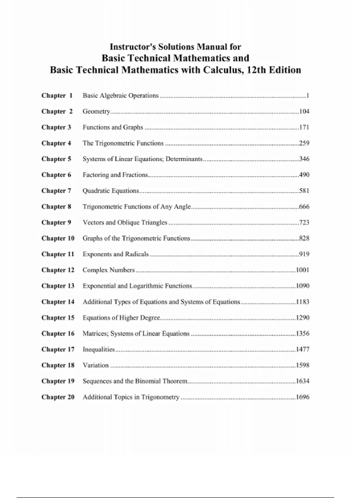 Solutions Manual for Basic Technical Mathematics and Basic Technical Mathematics with Calculus, 12th Edition by Allyn Washington, Richard Evans, All Chapters 1-31 ; ISBN13: 9780137582792....(Full Chapters included Chapter 1 to 31)...Chapter 1 Basic Algebraic Operations Chapter 2 Geometry Chapter 3 Functions and Graphs Chapter 4 The Trigonometric Functions Chapter 5 Systems of Linear Equations; Determinants Chapter 6 Factoring and Fractions Chapter 7 Quadratic Equations Chapter 8 Trigonometric Functions of Any Angle Chapter 9 Vectors and Oblique Triangles Chapter 10 Graphs of the Trigonometric Functions Chapter 11 Exponents and Radicals Chapter 12 Complex Numbers Chapter 13 Exponential and Logarithmic Functions Chapter 14 Additional Types of Equations and Systems of Equations Chapter 15 Equations of Higher Degree Chapter 16 Matrices; Systems of Linear Equations Chapter 17 Inequalities Chapter 18 Variation Chapter 19 Sequences and the Binomial Theorem Chapter 20 Additional Topics in Trigonometry Chapter 21 Plane Analytic Geometry Chapter 22 Introduction to Statistics Chapter 23 The Derivative Chapter 24 Applications of the Derivative Chapter 25 Integration Chapter 26 Applications of Integration Chapter 27 Differentiation of Transcendental Functions Chapter 28 Methods of Integration Chapter 29 Partial Derivatives and Double Integrals Chapter 30 Expansion of Functions in Series Chapter 31 Differential Equations