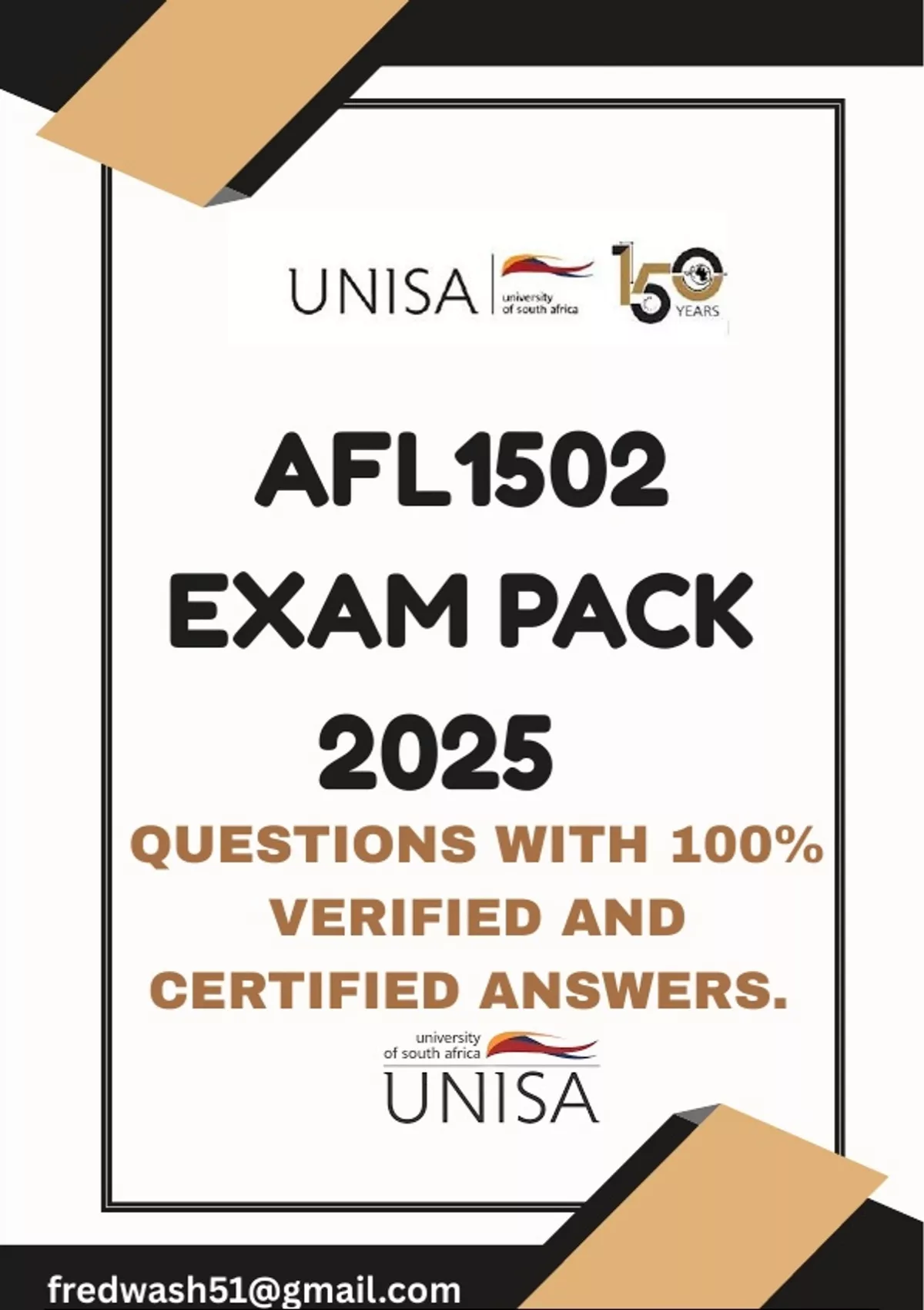 AFL1502 EXAM PACK 2025 QUESTIONS WITH 100% VERIFIED AND CERTIFIED ANSWERS. WRITTEN IN REQUIRED FORMAT AND WITHIN GIVEN GUIDELINES. IT IS GOOD TO USE AS A GUIDE AND FOR REFERENCE, NEVER PLAGARIZE. Thank you and success in your academics.