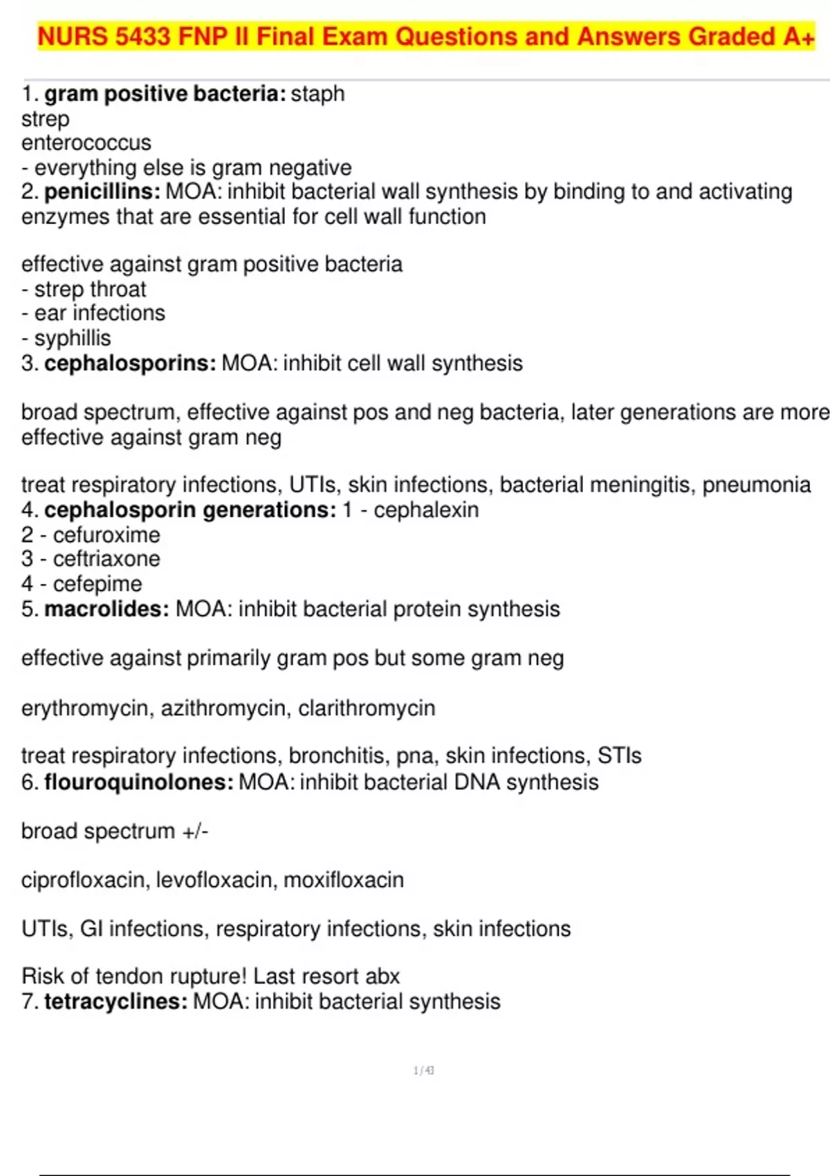 6. flouroquinolones: MOA: inhibit bacterial DNA synthesis