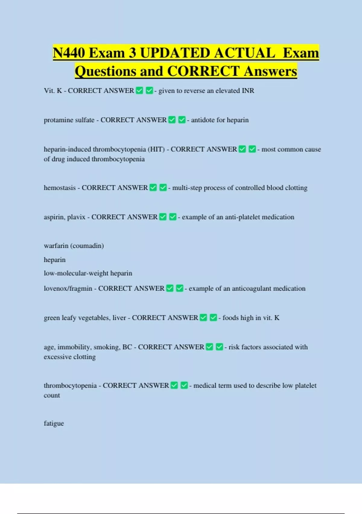 N440 Exam 3 UPDATED ACTUAL Exam Questions and CORRECT Answers Vit. K - CORRECT ANSWER - given to reverse an elevated INR protamine sulfate - CORRECT ANSWER - antidote for heparin heparin-induced thrombocytopenia (HIT) - CORRECT ANSWER of drug induced thrombocytopenia hemostasis - CORRECT ANSWER - most common cause - multi-step process of controlled blood clotting