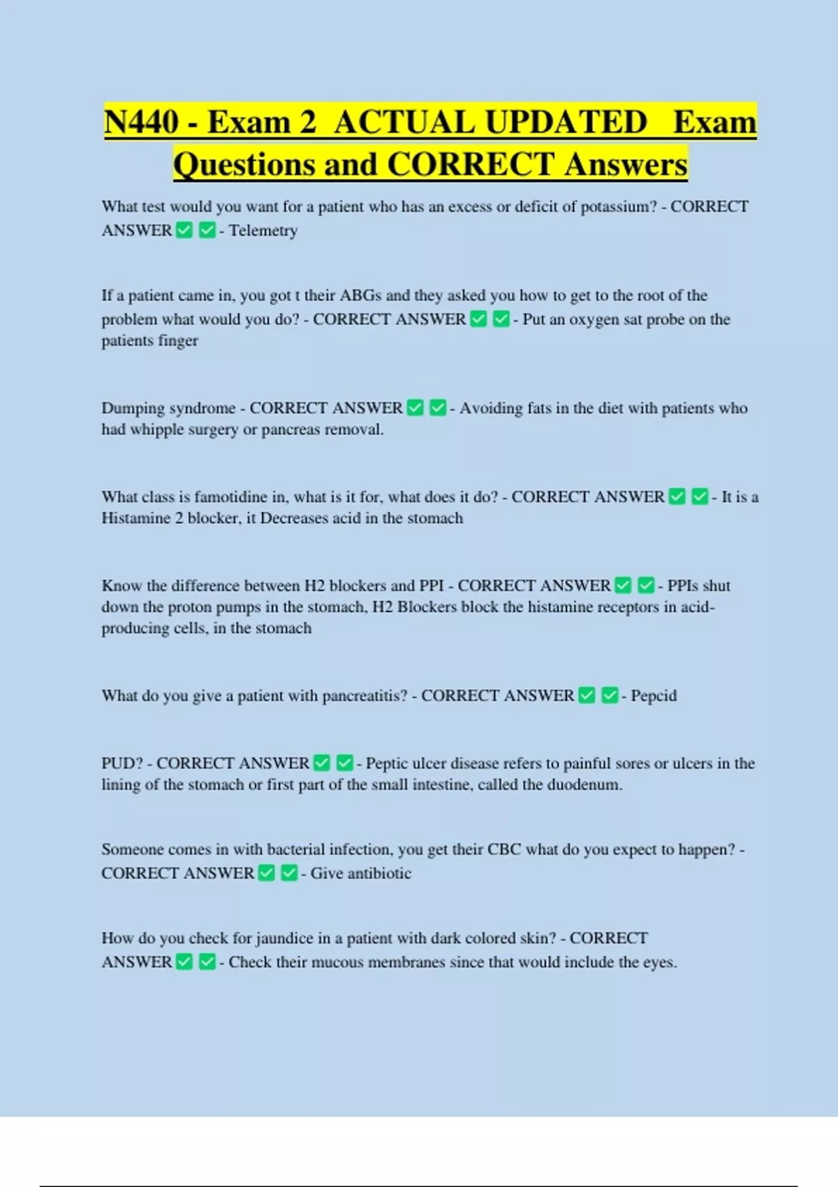 N440 - Exam 2 ACTUAL UPDATED Exam Questions and CORRECT Answers What test would you want for a patient who has an excess or deficit of potassium? - CORRECT ANSWER - Telemetry If a patient came in, you got t their ABGs and they asked you how to get to the root of the problem what would you do? - CORRECT ANSWER - Put an oxygen sat probe on the patients finger Dumping syndrome - CORRECT ANSWER had whipple surgery or pancreas removal. - Avoiding fats in the diet with patients who