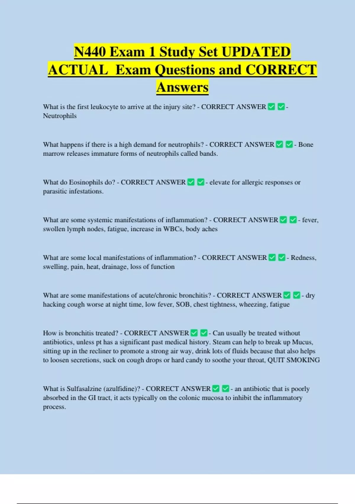 N440 Exam 1 Study Set UPDATED ACTUAL Exam Questions and CORRECT Answers What is the first leukocyte to arrive at the injury site? - CORRECT ANSWER Neutrophils What happens if there is a high demand for neutrophils? - CORRECT ANSWER marrow releases immature forms of neutrophils called bands. What do Eosinophils do? - CORRECT ANSWER - - Bone - elevate for allergic responses or parasitic infestation