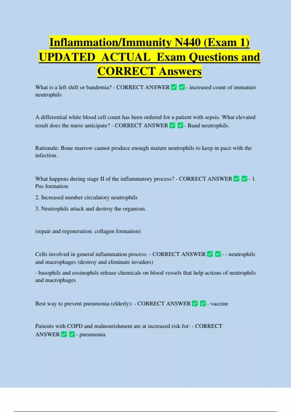 Inflammation/Immunity N440 (Exam 1) UPDATED ACTUAL Exam Questions and CORRECT Answers What is a left shift or bandemia? - CORRECT ANSWER neutrophils - increased count of immature A differential white blood cell count has been ordered for a patient with sepsis. What elevated result does the nurse anticipate? - CORRECT ANSWER - Band neutrophils. Rationale: Bone marrow cannot produce enough mature neutrophils to keep in pace with the infection.