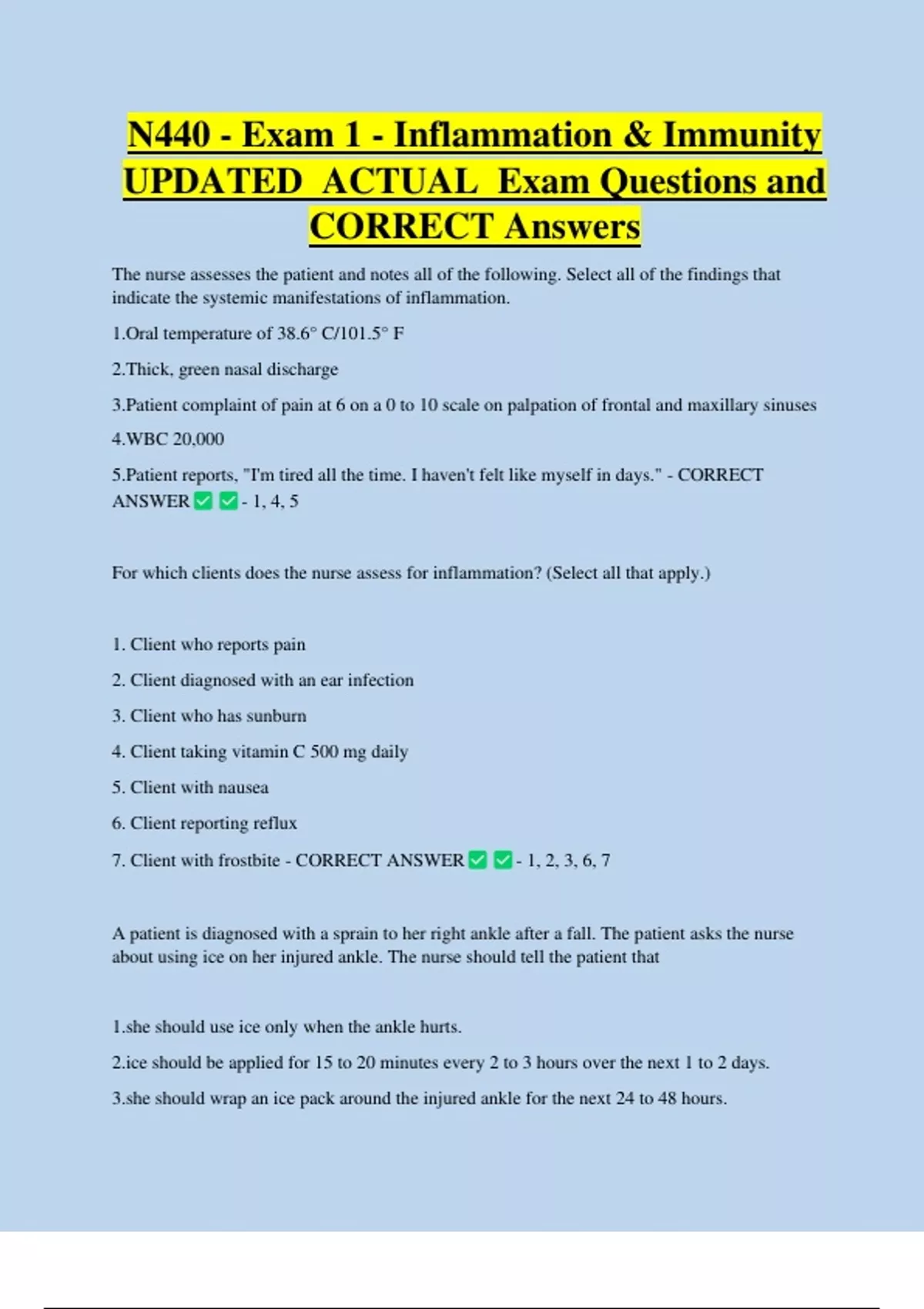 7. Client with frostbite - CORRECT ANSWER - 1, 2, 3, 6, 7