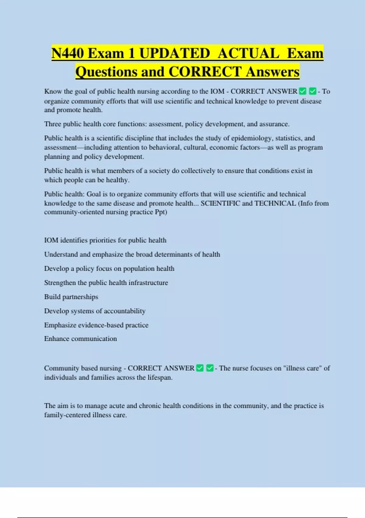 N440 Exam 1 UPDATED ACTUAL Exam Questions and CORRECT Answers Know the goal of public health nursing according to the IOM - CORRECT ANSWER - To organize community efforts that will use scientific and technical knowledge to prevent disease and promote health. Three public health core functions: assessment, policy development, and assurance. Public health is a scientific discipline that includes the study of epidemiology, statistics, and assessment—including attention to behavioral, cultural, economic factors—as well as program planning and policy development. Public health is what members of a society do collectively to ensure that conditions exist in which people can be healthy. Public health: Goal is to organize community efforts that will use scientific and technical knowledge to the same disease and promote health... SCIENTIFIC and TECHNICAL (Info from community-oriented nursing practice Ppt)