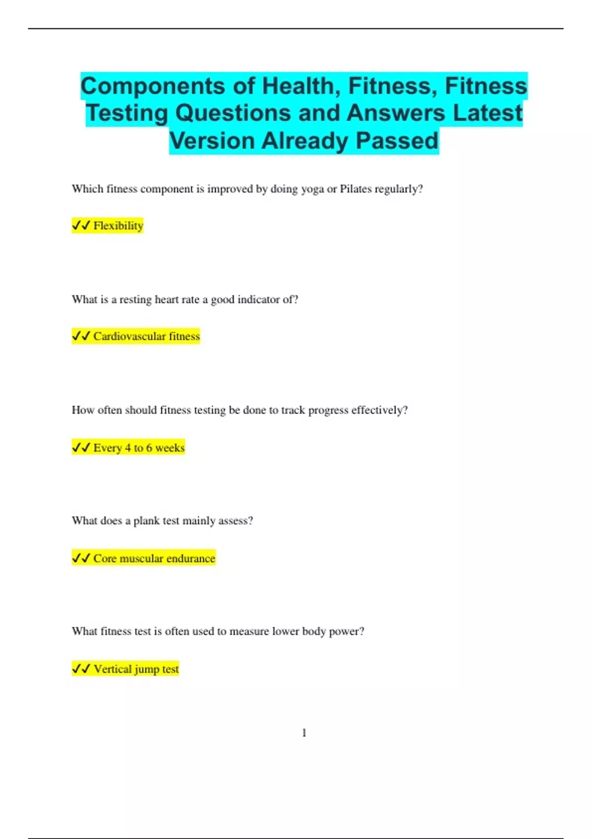 Components of Health, Fitness, Fitness Testing Questions and Answers Latest Version Already Passed Which fitness component is improved by doing yoga or Pilates regularly? Flexibility What is a resting heart rate a good indicator of? Cardiovascular fitness How often should fitness testing be done to track progress effectively? Every 4 to 6 weeks What does a plank test mainly assess? Core muscular endurance What fitness test is often used to measure lower body power? Vertical jump test 2 What health component involves eating balanced meals and staying active? Physical health Why is muscular strength important in daily life? It helps lift, push, and pull objects safely and efficiently What is the main component of fitness responsible for how efficiently your heart and lungs work during activity? Cardiovascular endurance Which component of fitness measures how long a muscle can perform without getting tired? Muscular endurance What is flexibility in terms of fitness? The range of motion around a joint What is the term for the ability of a muscle to produce maximum force? Muscular strength 3 What is body composition? The ratio of fat to lean tissue in the body Which test is commonly used to assess cardiovascular fitness? The 1.5-mile run or beep test What is the best test to measure flexibility? The sit-and-reach test Why is fitness testing important? It helps evaluate physical ability and track progress over time What component of fitness is improved by stretching regularly? Flexibility What does a healthy body composition look like? A balanced proportion of body fat and lean muscle mass 4 Which component of health includes emotional and mental well-being? Mental health