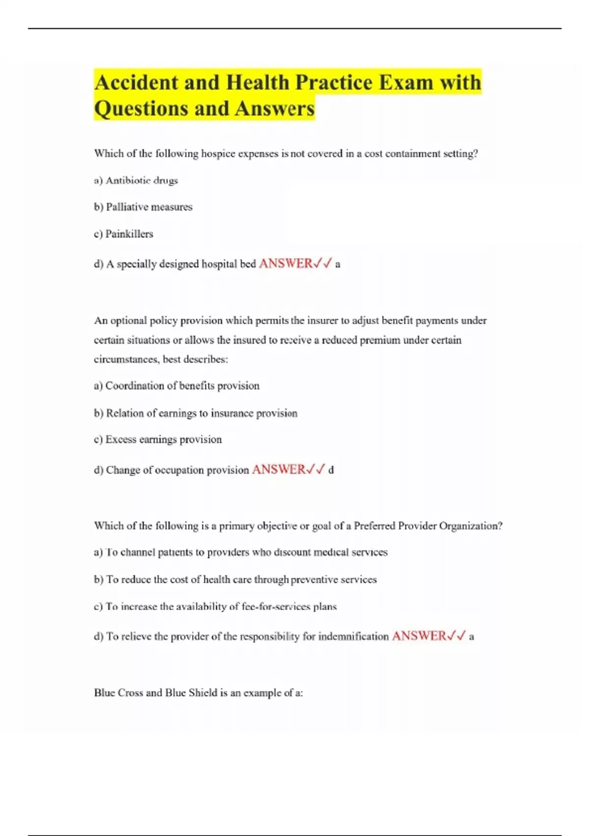 Accident and Health Practice Exam with Questions and Answers Which of the following hospice expenses is not covered in a cost containment setting? a) Antibiotic drugs b) Palliative measures c) Painkillers d) A specially designed hospital bed ANSWER a An optional policy provision which permits the insurer to adjust benefit payments under certain situations or allows the insured to receive a reduced premium under certain circumstances, best describes: a) Coordination of benefits provision b) Relation of earnings to insurance provision c) Excess earnings provision d) Change of occupation provision ANSWER d Which of the following is a primary objective or goal of a Preferred Provider Organization? a) To channel patients to providers who discount medical services b) To reduce the cost of health care through preventive services c) To increase the availability of fee-for-services plans d) To relieve the provider of the responsibility for indemnification ANSWER a Blue Cross and Blue Shield is an example of a: a) Service insurer