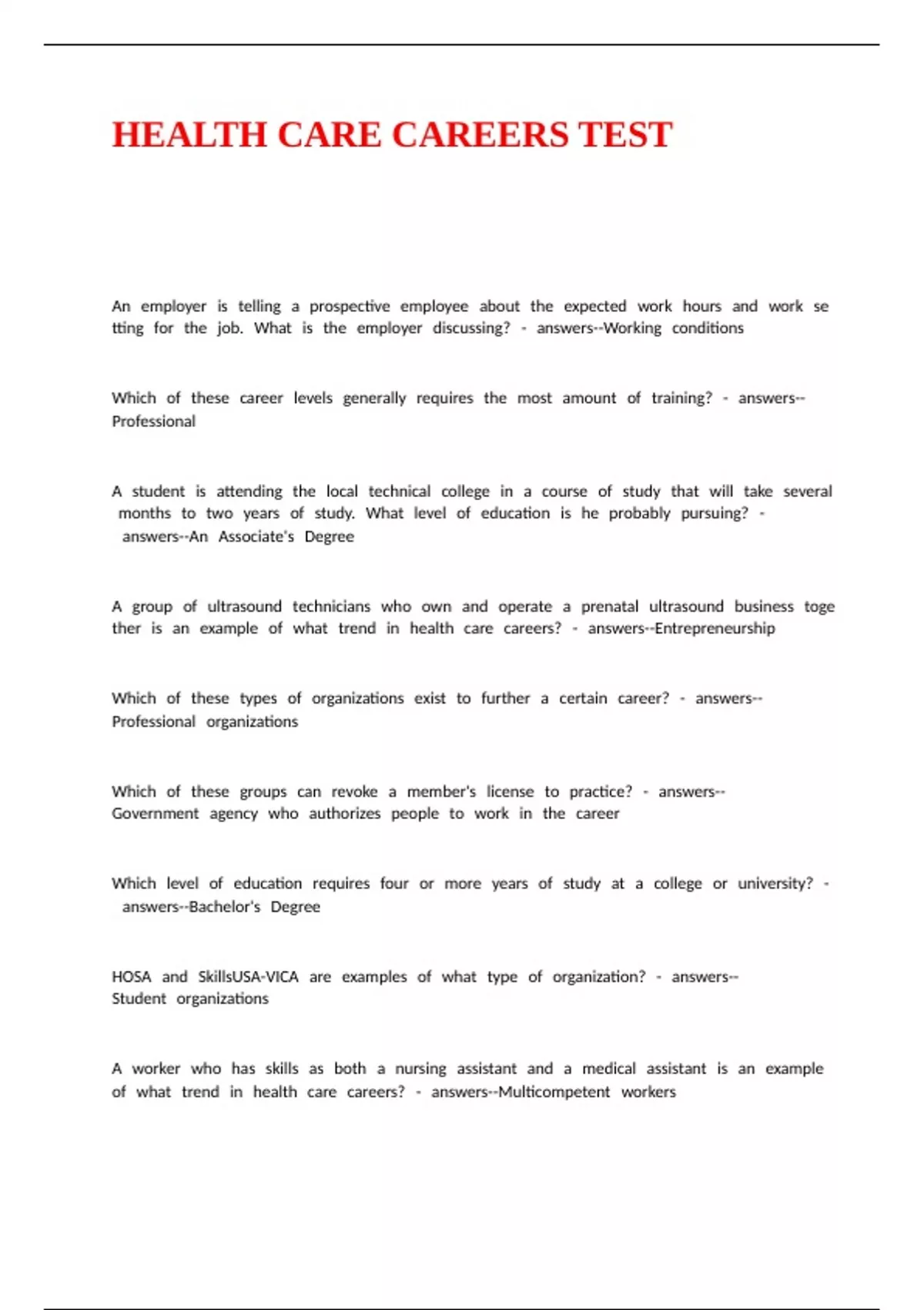 HEALTH CARE CAREERS TEST
