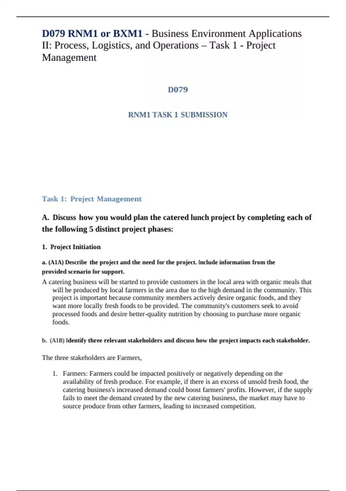 D079 RNM1 or BXM1 - Business Environment Applications II: Process, Logistics, and Operations“ Task 1 - Project Management D079 RNM1 TASK 1 SUBMISSION Task 1: Project Management A. Discuss how you would plan the catered lunch project by completing each of the following 5 distinct project phases: 1. Project Initiation a. (A1A) Describe the project and the need for the project. Include information from the provided scenario for support. A catering business will be started to provide customers in the local area with organic meals that will be produced by local farmers in the area due to the high demand in the community. This project is important because community members actively desire organic foods, and they want more locally fresh foods to be provided. The community's customers seek to avoid processed foods and desire better-quality nutrition by choosing to purchase more organic foods. b