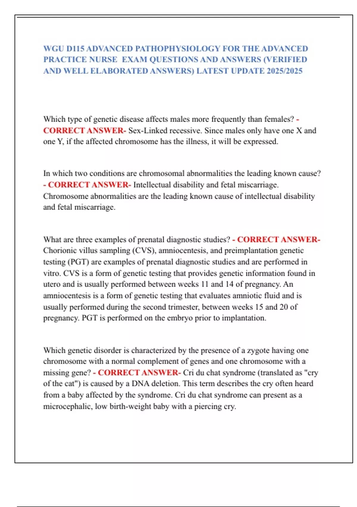 WGU D115 ADVANCED PATHOPHYSIOLOGY FOR THE ADVANCED PRACTICE NURSE EXAM QUESTIONS AND ANSWERS (VERIFIED AND WELL ELABORATED ANSWERS) LATEST UPDATE 2025/2025