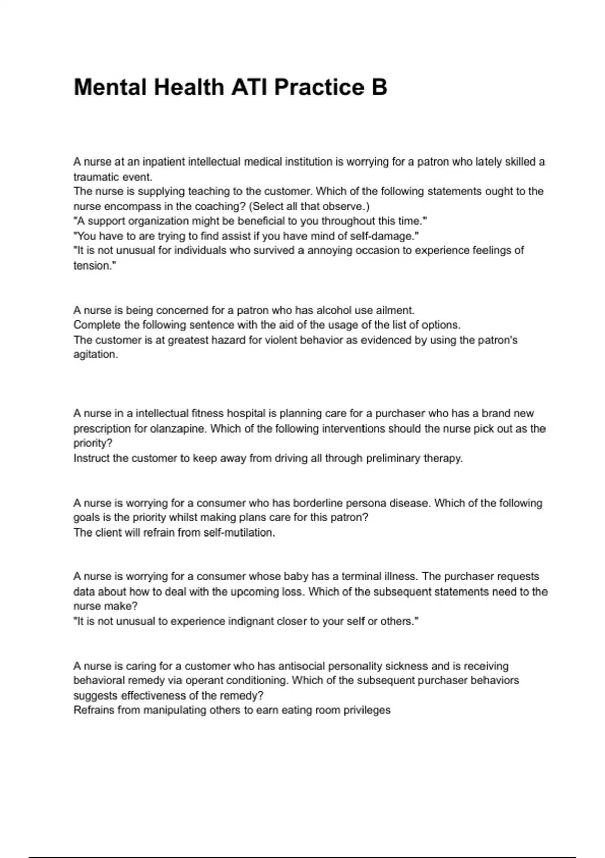 A nurse in a intellectual fitness hospital is planning care for a purchaser who has a brand new