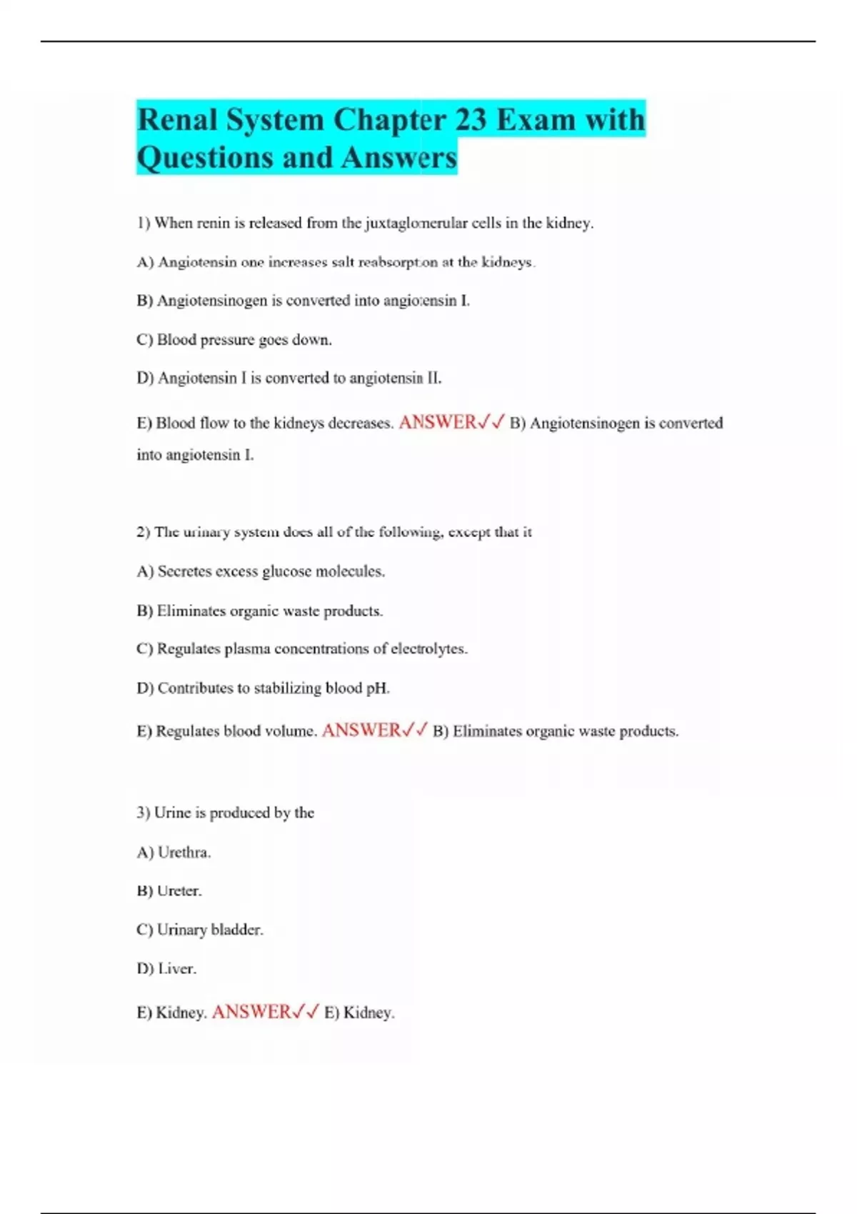 Renal System Chapter 23 Exam with Questions and Answers 1) When renin is released from the juxtaglomerular cells in the kidney. A) Angiotensin one increases salt reabsorption at the kidneys. B) Angiotensinogen is converted into angiotensin I. C) Blood pressure goes down. D) Angiotensin I is converted to angiotensin II. E) Blood flow to the kidneys decreases. ANSWER B) Angiotensinogen is converted into angiotensin I. 2) The urinary system does all of the following, except that it A) Secretes excess glucose molecules. B) Eliminates organic waste products. C) Regulates plasma concentrations of electrolytes. D) Contributes to stabilizing blood pH. E) Regulates blood volume. ANSWER B) Eliminates organic waste products. 3) Urine is produced by the A) Urethra. B) Ureter. C) Urinary bladder. D) Liver. E) Kidney. ANSWER E) Kidney.