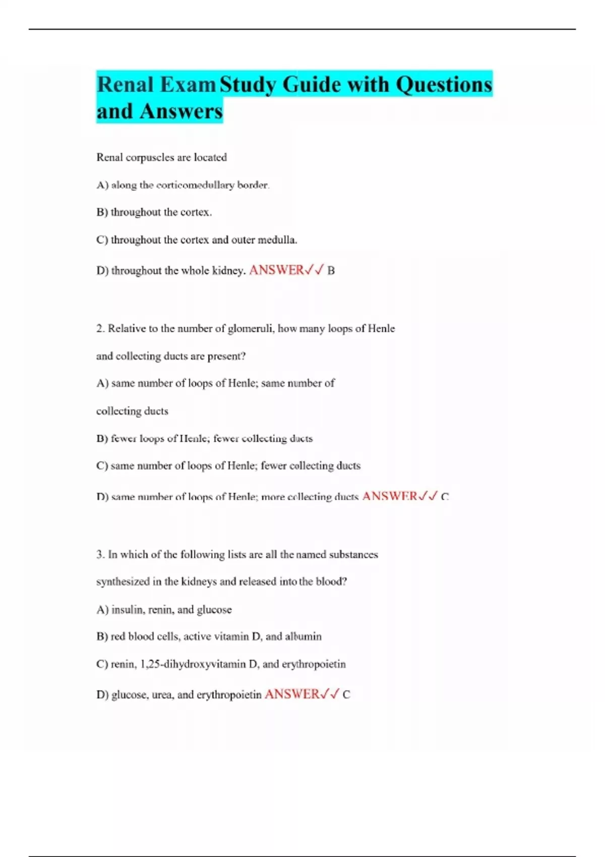 Renal Exam Study Guide with Questions and Answers Renal corpuscles are located A) along the corticomedullary border. B) throughout the cortex. C) throughout the cortex and outer medulla. D) throughout the whole kidney. ANSWER B 2. Relative to the number of glomeruli, how many loops of Henle and collecting ducts are present? A) same number of loops of Henle; same number of collecting ducts B) fewer loops of Henle; fewer collecting ducts C) same number of loops of Henle; fewer collecting ducts D) same number of loops of Henle; more collecting ducts ANSWER C 3. In which of the following lists are all the named substances synthesized in the kidneys and released into the blood? A) insulin, renin, and glucose B) red blood cells, active vitamin D, and albumin C) renin, 1,25-dihydroxyvitamin D, and erythropoietin D) glucose, urea, and erythropoietin ANSWER C 4. The macula densa is a group of cells located in the wall of