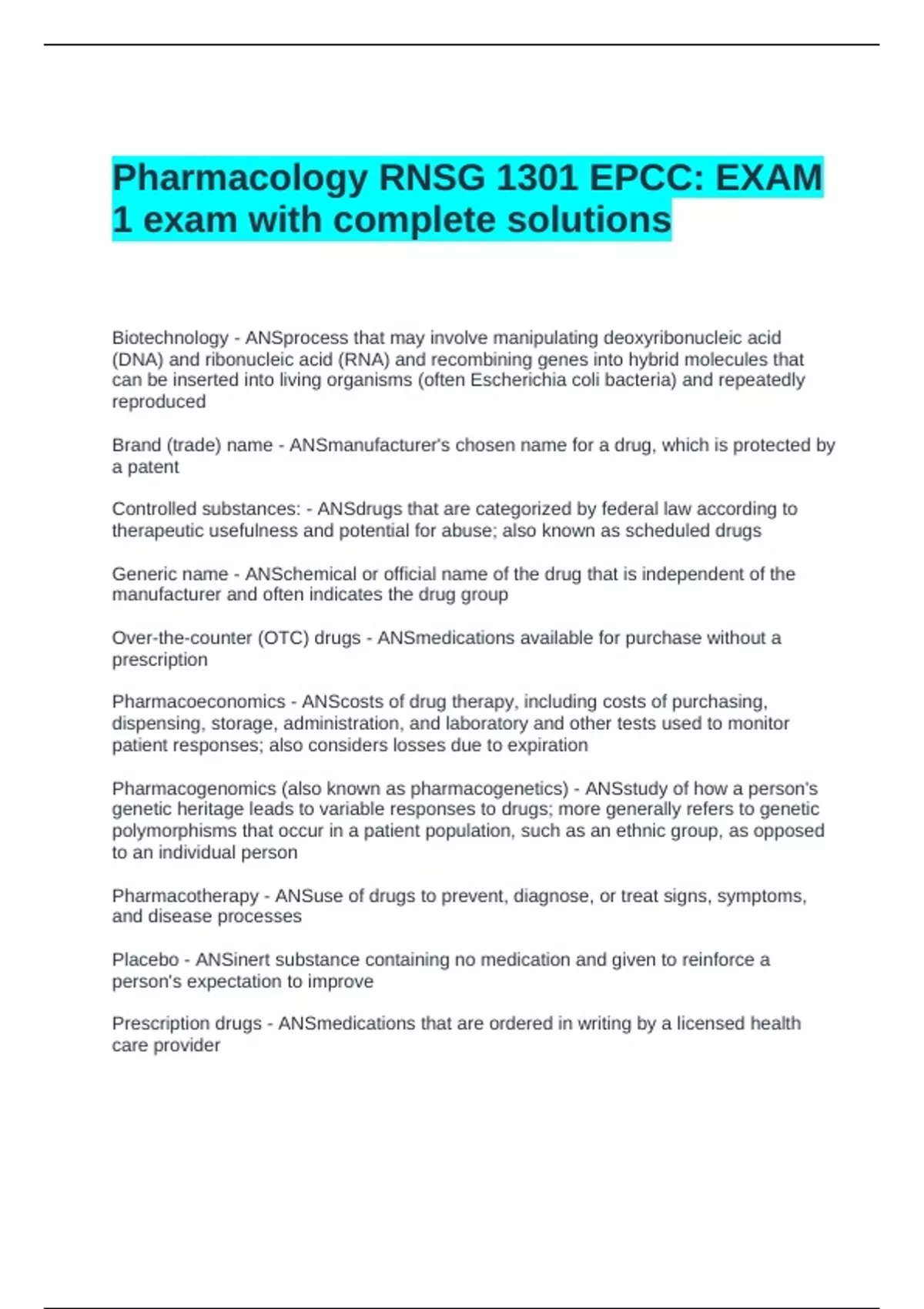 Pharmacology RNSG 1301 EPCC: EXAM