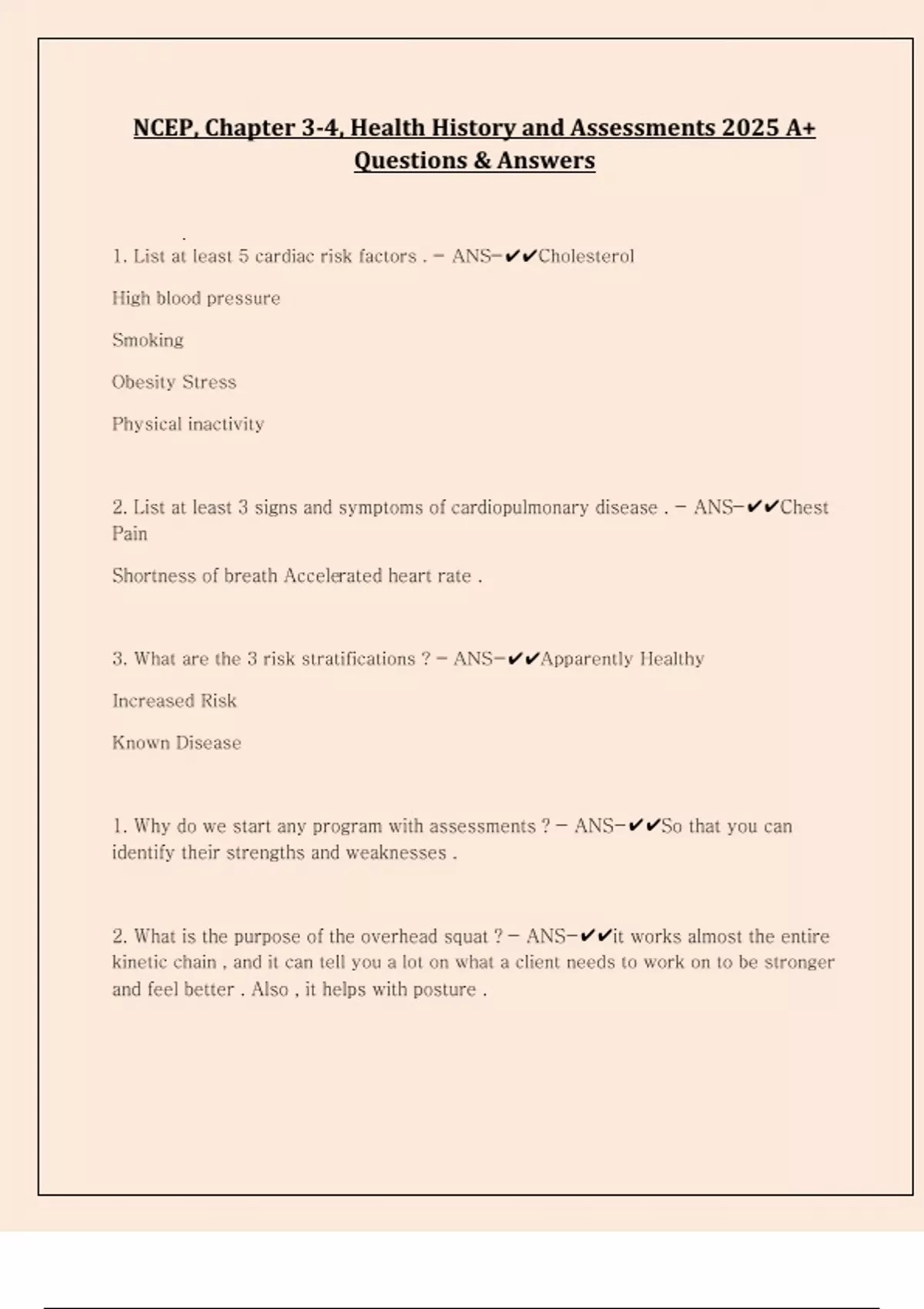 NCEP, Chapter 3-4, Health History and Assessments 2025 A+ Questions & Answers 1. List at least 5 cardiac risk factors . - ANS-Cholesterol High blood pressure Smoking Obesity Stress Physical inactivity 2. List at least 3 signs and symptoms of cardiopulmonary disease . - ANS-Chest Pain Shortness of breath Accelerated heart rate . 3. What are the 3 risk stratifications ? - ANS