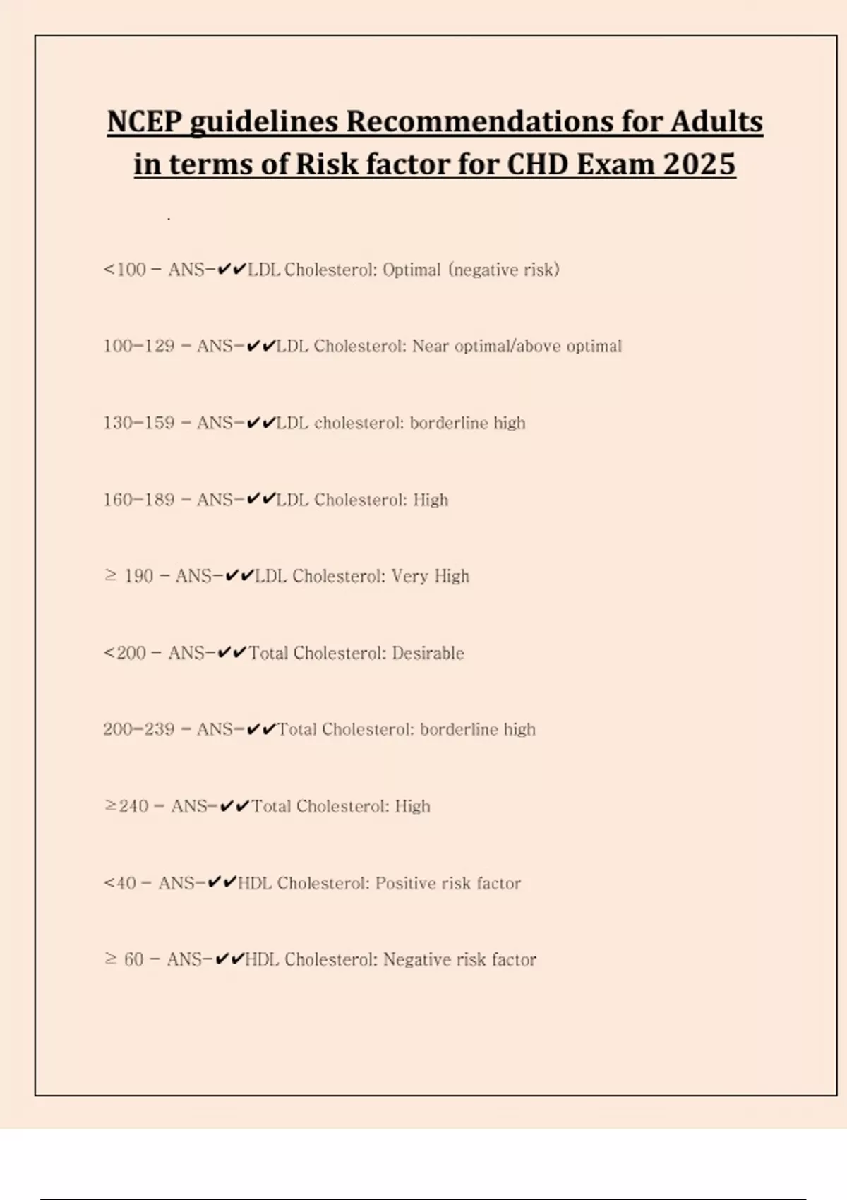 NCEP guidelines Recommendations for Adults in terms of Risk factor for CHD Exam 2025 <100 - ANS-LDL Cholesterol: Optimal (negative risk) 100-129 - ANS-LDL Cholesterol: Near optimal/above optimal 130-159 - ANS-LDL cholesterol: borderline high 160-189 - ANS-LDL
