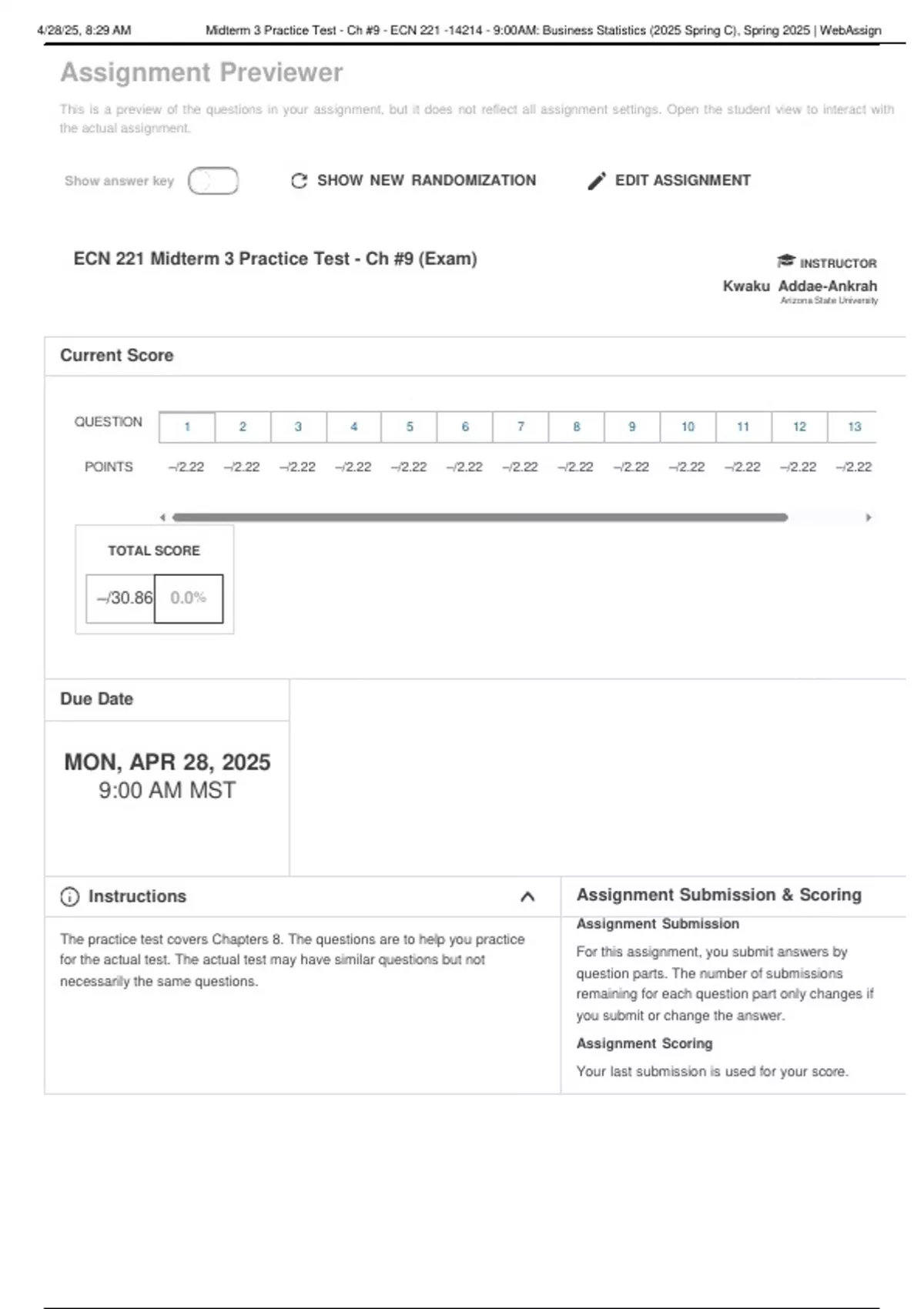 4/28/25, 8:29 AM Midterm 3 Practice Test - Ch #9 - ECN 221 -14214 - 9:00AM: Business Statistics (2025 Spring C), Spring 2025 | WebAssign
