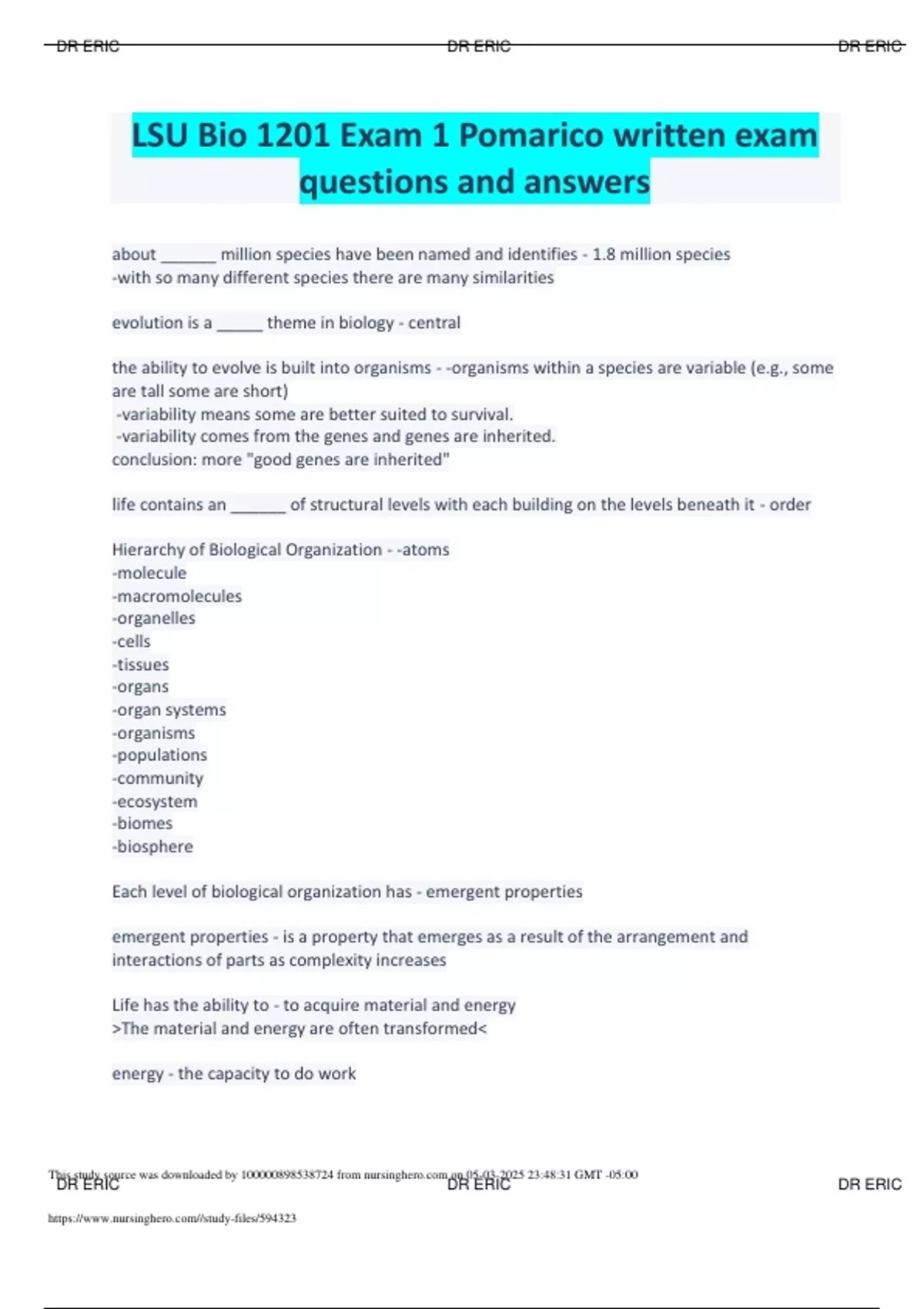 LSU Bio 1201 Exam 1 Pomarico written exam questions and answers about ______ million species have been named and identifies - 1.8 million species -with so many different species there are many similarities evolution is a _____ theme in biology - central the ability to evolve is built into organisms - -organisms within a species are variable (e.g., some are tall some are short) -variability means some are better suited to survival. -variability comes from the genes and genes are inherited. conclusion: more "good genes are inherited" life contains an ______ of structural levels with each building on the levels beneath it - order Hierarchy of Biological Organization - -atoms -molecule -macromolecules -organelles -cells -tissues -organs -organ systems -organisms -populations -community -ecosystem -biomes -biosphere Each level of biological organization has - emergent properties emergent properties - is a property that emerges as a result of the arrangement and interactions of parts as complexity increases Life has the ability to - to acquire material and energy >The material and energy are often transformed< energy - the capacity to do work This study source was downloaded by from on :48:31 GMT -05:00 DR ERIC DR ERIC DR ERIC DR ERIC DR ERIC DR ERIC All levels of biological organization are thermodynamically - "open systems" Structure and function - are related Organisms _________ and cells are the ________________ - reproduce basic unit of life prokaryotic cells - are cells which lack internal cellular membranes (no nucleus or organelles) eukaryotic cells - are cells which have a membrane closed nucleus and membrane-enclosed organelles DNA is the basis of heritable information The passing of DNA from one generation to another is the basis of - inheritance. inheritance - Acquisition of traits by transmission of DNA from parent to offspring. This process of transmitting the DNA to new generations is built into the functions of reproduction. DNA also provides the instructional methods that guide the ________________________________ of multicellular organism. . - growth and development Organisms have the ability to maintain their structure and regulate their internal environment. ___________________ and _______________ are the 2 common mechanism used for regulation. - Negative feedback positive feedback Homeostasis - A tendency to maintain a balanced or constant internal state; the regulation of any aspect of body chemistry, such as blood glucose, around a particular level There are two _____________ domains :Bacteria and Archaea, and a ________________domain : Eukarya - prokaryotic eukaryotic In domain Eukarya there are currently four subdivisions known as kingdoms : - Protista, plantae, fungi, and animalia Science is an activity that often involves one of 2 methods : - discovery science and hypothesis based science Quantitative data and qualitative data Both methods also follow certain principles - 1) all events have a natural cause - natural causality This study source was downloaded by from on :48:31 GMT -05:00 DR ERIC DR ERIC DR ERIC DR ERIC DR ERIC DR ERIC 2) natural causes obey natural laws 3) natural laws don't change with time or distance Hypothesis based science uses a ---------------- process and deductive reasoning - HYPOTHETICO￾DEDUCTIVE the scientific method - Make observations - Lights don't go on when you flip the light switch. Form a hypothesis - Bulb is burned out. Conduct experiments - Change the bulb. Make conclusions - do the results of the experiments support your hypothesis If not then you have to change your hypothesis If they do then your one step closer to a theory theory - is an explanation of natural events that is based on a LARGE number of observations and/or experiments. matter - Anything that has mass and takes up space mass - is the amount of material in an object (mass does not equal weight) element - a substance that cannot be broken down or converted to a different substance by chemical reactions Make up 96% of living matter - Oxygen (O), Carbon (C), Hydrogen (H), Nitrogen (N) trace elements - elements required by an organism in only minute quantities K = potassium ------ S = sulfur P = phosphorous Ca = calcium Na = sodium 3.7% Cl = chlorine Mg = magnesium Atom - The smallest unit of matter that retains the properties of an element Atoms are made up of - subatomic particles