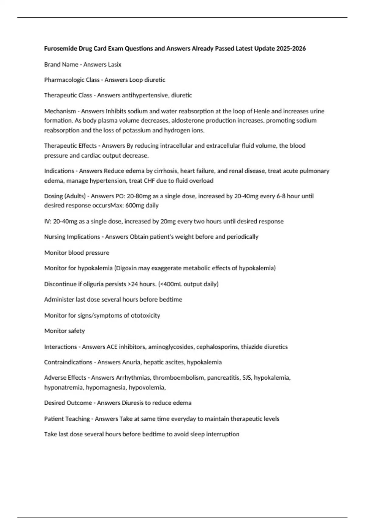 Furosemide Drug Card Exam Questions and Answers Already Passed Latest Update 2025-2026