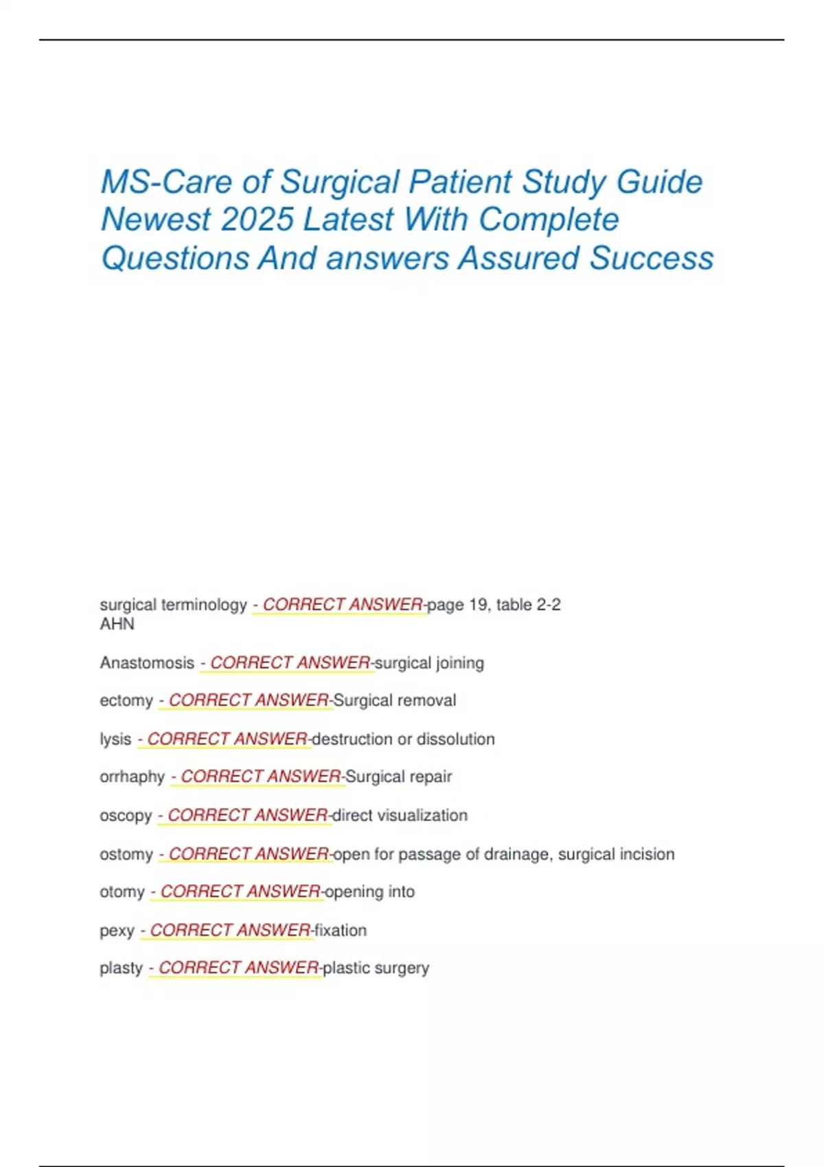 MS-Care of Surgical Patient Study Guide Newest 2025 Latest With Complete Questions And answers Assured Success