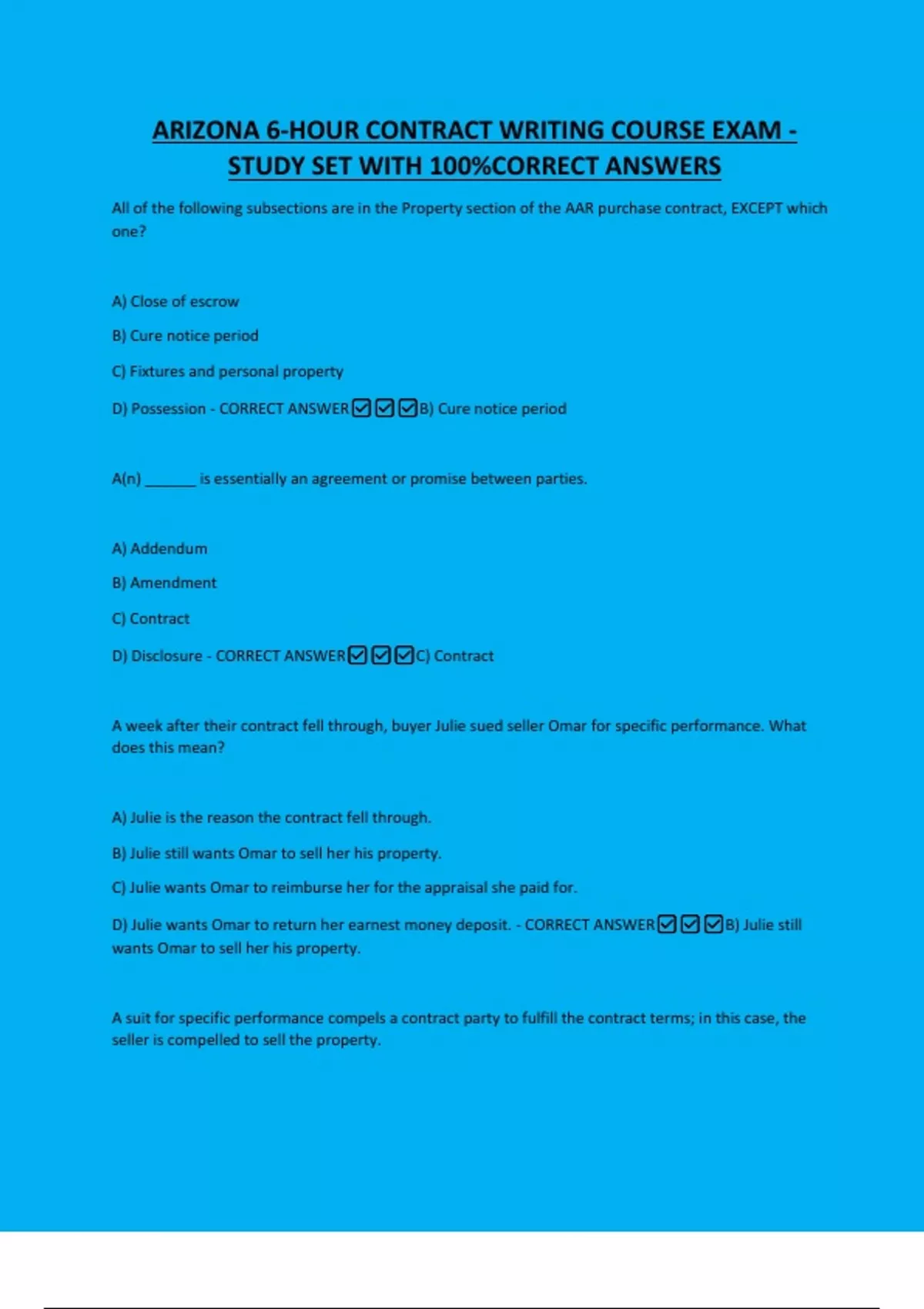 ARIZONA 6-HOUR CONTRACT WRITING COURSE EXAM - STUDY SET WITH 100%CORRECT ANSWERS All of the following subsections are in the Property section of the AAR purchase contract, EXCEPT which one? A) Close of escrow B) Cure notice period C) Fixtures and personal property D) Possession - CORRECT ANSWERB) Cure notice period