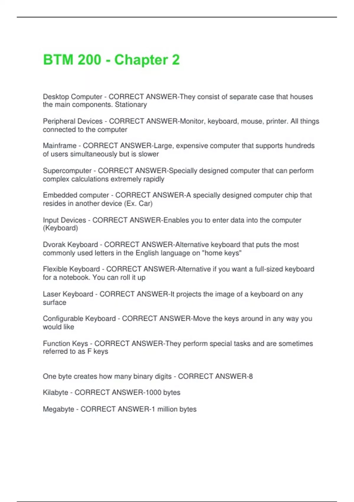 Desktop Computer - CORRECT ANSWER-They consist of separate case that houses the main components. Stationary Peripheral Devices - CORRECT ANSWER-Monitor, keyboard, mouse, printer. All things connected to the computer Mainframe - CORRECT ANSWER-Large, expensive computer that supports hundreds of users simultaneously but is slower Supercomputer - CORRECT ANSWER-Specially designed computer that can perform complex calculations extremely rapidly Embedded computer - CORRECT ANSWER-A specially designed computer chip that resides in another device (Ex. Car) Input Devices - CORRECT ANSWER-Enables you to enter data into the computer (Keyboard) Dvorak Keyboard - CORRECT ANSWER-Alternative keyboard that puts the most commonly used letters in the English language on "home keys"