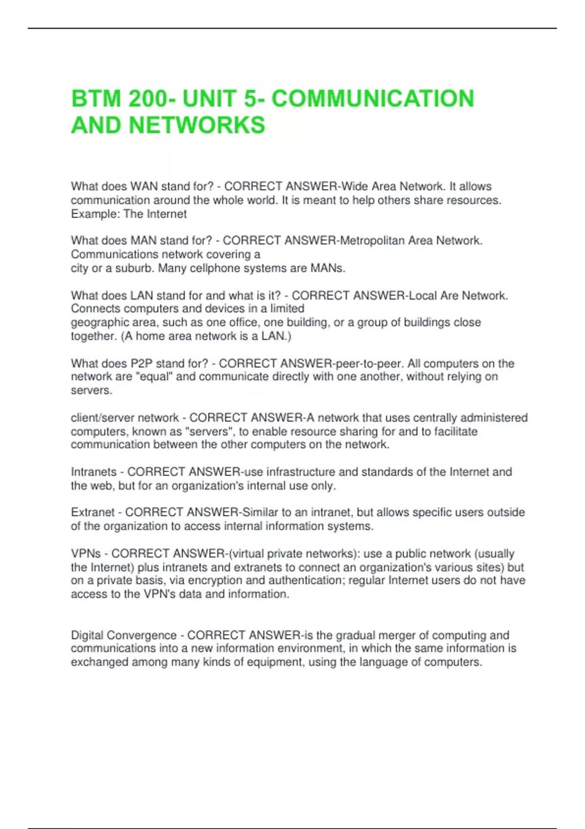 BTM 200- UNIT 5- COMMUNICATION AND NETWORKS QUESTIONS & ANSWERS VERIFIED 100% CORRECT!!