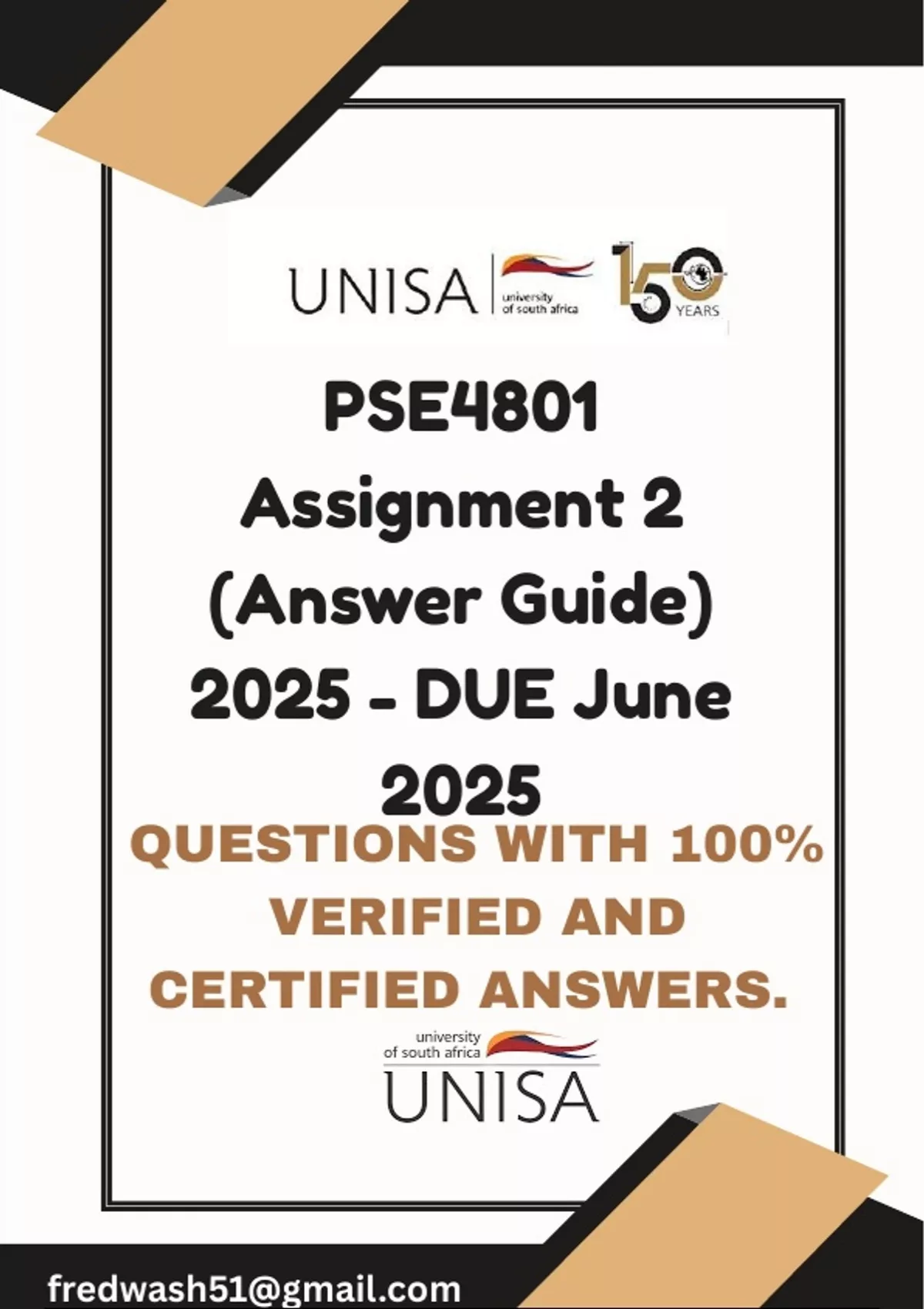PSE4801 Assignment 2 (Answer Guide) 2025 - DUE June 2025 QUESTIONS WITH 100% VERIFIED AND CERTIFIED ANSWERS. WRITTEN IN REQUIRED FORMAT AND WITHIN GIVEN GUIDELINES. IT IS GOOD TO USE AS A GUIDE AND FOR REFERENCE, NEVER PLAGARIZE. Thank you and success in your academics. PREPARED BY DR. FRED UNISA, 2025.