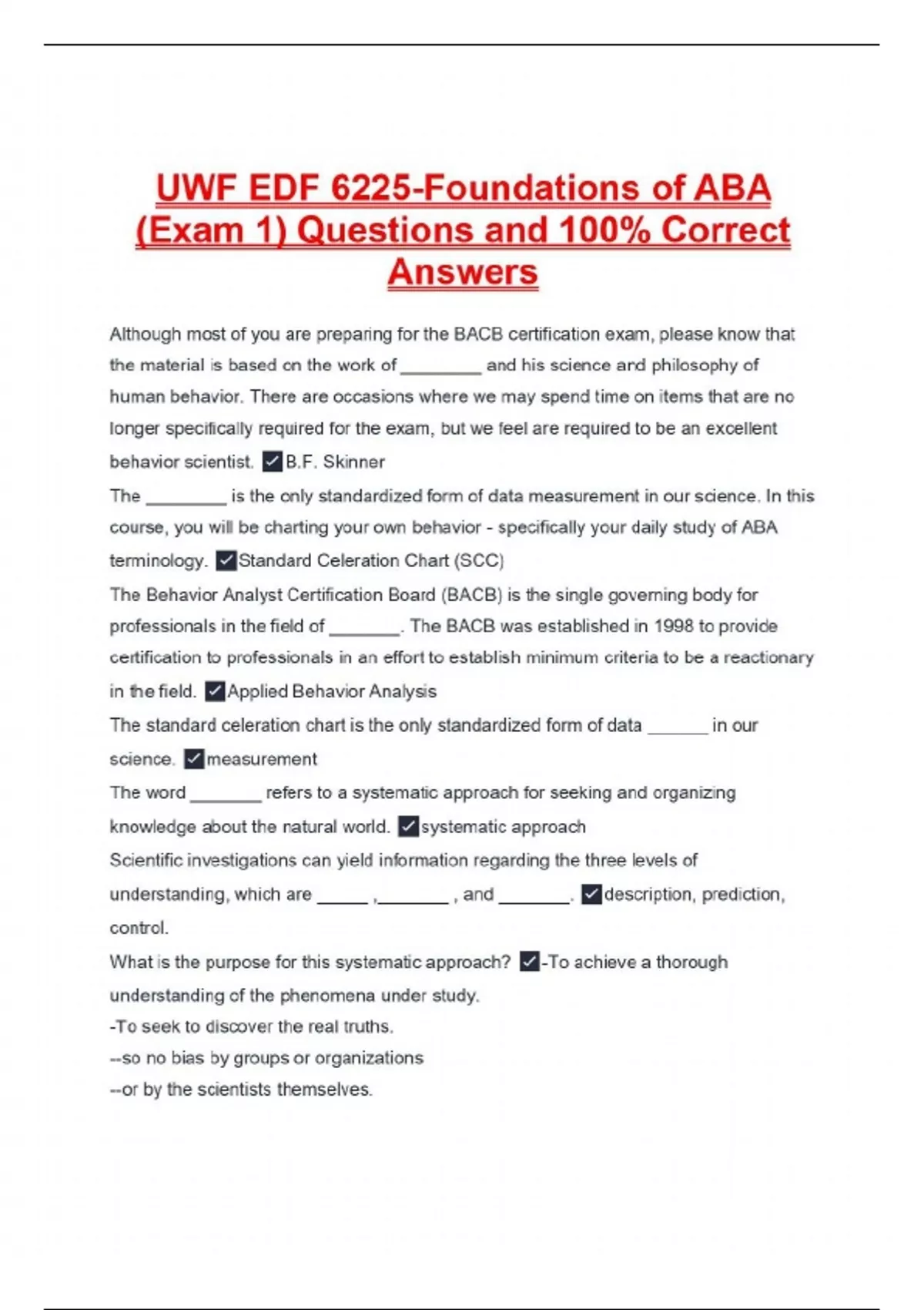 UWF EDF 6225-Foundations of ABA (Exam 1) Questions and 100% Correct Answers Although most of you are preparing for the BACB certification exam, please know that the material is based on the work of ________ and his science and philosophy of human behavior. There are occasions where we may spend time on items that are no longer specifically required for the exam, but we feel are required to be an excellent behavior scientist. B.F. Skinner The ________ is the only standardized form of data measurement in our science. In this course, you will be charting your own behavior - specifically your daily study of ABA terminology. Standard Celeration Chart (SCC) The Behavior Analyst Certification Board (BACB) is the single governing body for professionals in the field of _______. The BACB was established in 1998 to provide certification to professionals in an effort to establish minimum criteria to be a reactionary in the field. Applied Behavior Analysis The standard celeration chart is the only standardized form of data ______ in our science. measurement The word _______ refers to a systematic approach for seeking and organizing knowledge about the natural world. systematic approach Scientific investigations can yield information regarding the three levels of understanding, which are _____ ,_______ , and _______. description, prediction, control. What is the purpose for this systematic approach? -To achieve a thorough understanding of the phenomena under study. -To seek to discover the real truths. --so no bias by groups or organizations --or by the scientists themselves. _______ studies produce a collection of facts about the observed events that can be quantified, classified, and examined for possible relations with other known facts. (Can also suggest hypothesis, questions, or additional research ideas.) Description The highest level of scientific understanding is ________ . In this regard, we specifically manipulate one event (the independent variable) in order to produce a reliable change in another event (the dependent variable), and the change in the dependent variable is not likely due to other extraneous factors (known as confounding variables). This relationship is referred to as a _______. Control; functional relationship The _________ is the event in which we observe change. dependent variable What is a functional relationship? It exists when a well-controlled experiment demonstrates that a specific change in one event (the dependent variable) is reliably produced by specific manipulations of another event (the independent variable), and that the change in the dependent variable was unlikely to be the result of other extraneous factors (confounding variables). The _______ is the event in which we manipulate. independent variable