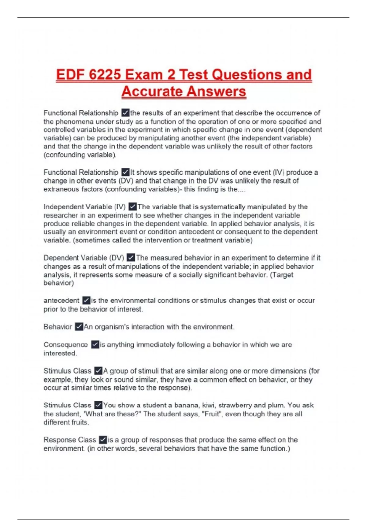 EDF 6225 Exam 2 Test Questions and Accurate Answers Functional Relationship the results of an experiment that describe the occurrence of the phenomena under study as a function of the operation of one or more specified and controlled variables in the experiment in which specific change in one event (dependent variable) can be produced by manipulating another event (the independent variable) and that the change in the dependent variable was unlikely the result of other factors (confounding variable). Functional Relationship It shows specific manipulations of one event (IV) produce a change in other events (DV) and that change in the DV was unlikely the result of extraneous factors (confounding variables)- this finding is the.... Independent Variable (IV) The variable that is systematically manipulated by the researcher in an experiment to see whether changes in the independent variable produce reliable changes in the dependent variable. In applied behavior analysis, it is usually an environment event or condition antecedent or consequent to the dependent variable. (sometimes called the intervention or treatment variable) Dependent Variable (DV) The measured behavior in an experiment to determine if it changes as a result of manipulations of the independent variable; in applied behavior analysis, it represents some measure of a socially significant behavior. (Target behavior) antecedent is the environmental conditions or stimulus changes that exist or occur prior to the behavior of interest. Behavior An organism's interaction with the environment. Consequence is anything immediately following a behavior in which we are interested. Stimulus Class A group of stimuli that are similar along one or more dimensions (for example, they look or sound similar, they have a common effect on behavior, or they occur at similar times relative to the response). Stimulus Class You show a student a banana, kiwi, strawberry and plum. You ask the student, "What are these?" The student says, "Fruit", even though they are all different fruits. Response Class is a group of responses that produce the same effect on the environment. (in other words, several behaviors that have the same function.)