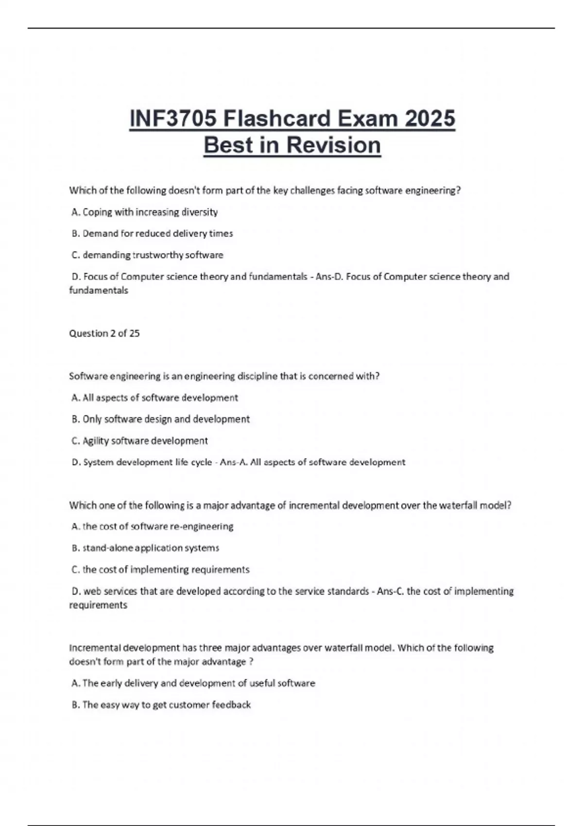 Which of the following doesn't form part of the key challenges facing software engineering? A. Coping with increasing diversity B. Demand for reduced delivery times C. demanding trustworthy software D. Focus of Computer science theory and fundamentals - Ans-D. Focus of Computer science theory and fundamentals Question 2 of 25 Software engineering is an engineering discipline that is concerned with? A. All aspects of software development B. Only software design and development C. Agility software development D. System development life cycle - Ans-A. All aspects of software development Which one of the following is a major advantage of incremental development over the waterfall model? A. the cost of software re-engineering B. stand-alone application systems C. the cost of implementing requirements D. web services that are developed according to the service standards - Ans-C. the cost of implementing requirements Incremental development has three major advantages over waterfall model. Which of the following doesn't form part of the major advantage ?......