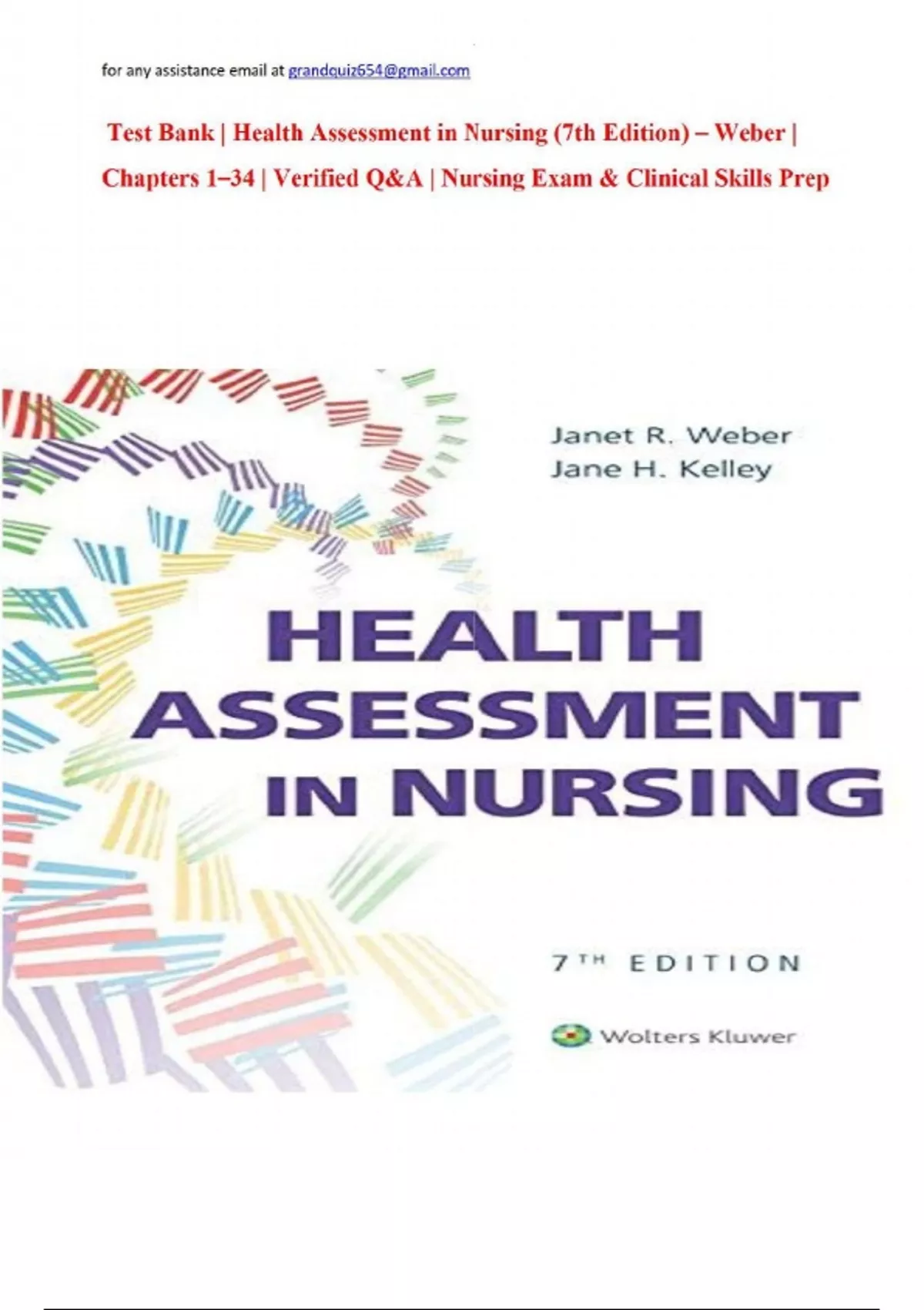 Test Bank | Health Assessment in Nursing (7th Edition) – Weber | Chapters 1–34 | Verified Q&A | Nursing Exam & Clinical Skills Prep Master physical assessment skills with this complete Test Bank for Health Assessment in Nursing (7th Edition) by Weber. Covering Chapters 1–34, it features NCLEX-style questions, accurate answers, and clinical rationales—ideal for nursing students preparing for exams, checkoffs, and patient assessments. What You’ll Get: Full coverage of all 34 chapters