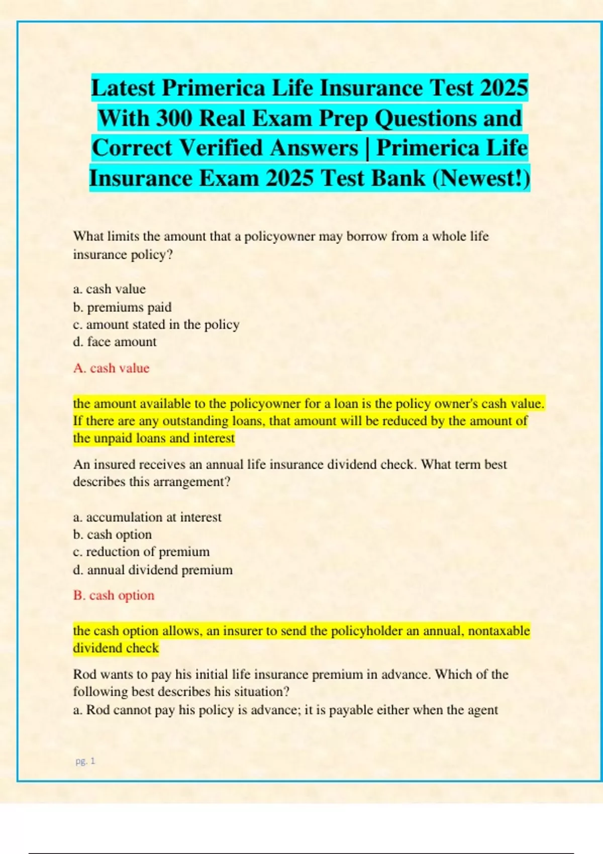 a. Rod cannot pay his policy is advance; it is payable either when the agent