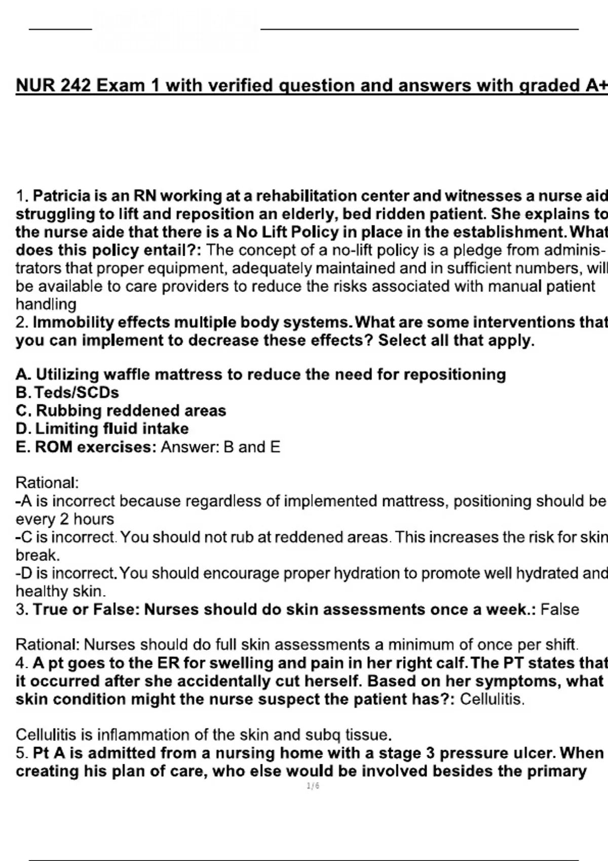 NUR 242 Exam 1 with verified question and answers with graded A+ 1. Patricia is an RN working at a rehabilitation center and witnesses a nurse aid struggling to lift and reposition an elderly, bed ridden patient. She explains to the nurse aide that there is a No Lift Policy in place in the establishment. What does this policy entail?: The concept of a no-lift policy is a pledge from adminis- trators that proper equipment, adequately maintained and in sufficient numbers, will be available to care providers to reduce the risks associated with manual patient handling 2. Immobility effects multiple body systems. What are some interventions that you can implement to decrease these effects? Select all that apply. A. Utilizing waffle mattress to reduce the need for repositioning B. Teds/SCDs C. Rubbing reddened areas D. Limiting fluid intake E. ROM exercises: Answer: B and E