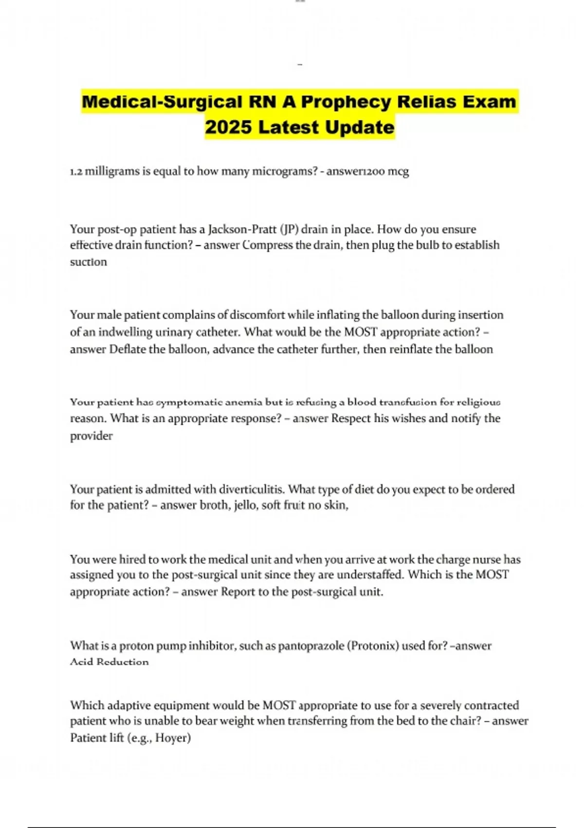 1.2 milligrams is equal to how many micrograms? - answer1200 mcg Your post-op patient has a Jackson-Pratt (JP) drain in place. How do you ensure effective drain function? – answer Compress the drain, then plug the bulb to establish suction Your male patient complains of discomfort while inflating the balloon during insertion of an indwelling urinary catheter. What would be the MOST appropriate action? – answer Deflate the balloon, advance the catheter further, then reinflate the balloon Your patient has symptomatic anemia but is refusing a blood transfusion for religious reason. What is an appropriate response? – answer Respect his wishes and notify the provider Your patient is admitted with diverticulitis. What type of diet do you expect to be ordered for the patient? – answer broth, jello, soft fruit no skin, You were hired to work the medical unit and when you arrive at work the charge nurse has assigned you to the post-surgical unit since they are understaffed. Which is the MOST appropriate action? – answer Report to the post-surgical unit. What is a proton pump inhibitor, such as pantoprazole (Protonix) used for? –answer Acid Reduction Which adaptive equipment would be MOST appropriate to use for a severely contracted patient who is unable to bear weight when transferring from the bed to the chair? – answer Patient lift (e.g., Hoyer) lOMoAR cPSD| Which tool should you use to assess pain in you 80-year-old patient with severe dementia? – answer PAINAD scale Your patient is admitted from the ED with failure to thrive and advanced dementia. You note he is extremely underweight, appears unbathed for some time, and has a stage 4 pressure injury to his coccyx. You were told in report that he lives at home with family members. What should you do? – answer Notify the charge nurse and social worker of your concerns. Your 85-year-old patient with atrial fibrillation fell at home 3 days ago. You notice she has been having several episodes of acute confusion since being admitted to your unit. What is the MOST important order you should anticipate from the provider? – answer Stat CT of head Your patient has a temp of 102.3 F, HR 122, and has had 15 mL of urine from the indwelling urinary catheter in the last 2 hours. What is your patient MOST likely experiencing. – answer Sepsis What type of personal protective equipment (PPE) is applied prior to entering a room for a patient with C. diff? – answer Gown and gloves Your patient continues to pull at their IV site located in their left forearm despite verbal reminders and increased observation. The nursing assistant recommends using soft mitt restraints on the patient. What is your recommendation? – answer Request an order for soft mitts as they are the least restrictive Your patient was admitted for a hypertensive crisis and has a history of HTN, Parkinson's disease, depression, and alcohol use. On his second hospitalized day, you notice he is more anxious and restless than his baseline. What would be your FIRST nursing intervention? – answer Ask the patient when his last drink of alcohol was. What is the BEST indication of an acute neurological problem? – answer Change in level of consciousness lOMoAR cPSD| While in a supine position your patient states, "I'm tired and cannot catch my breath." Physical assessment reveals jugular vein distention and a third heart sound (S3). These symptoms are indicative of what condition? – answer Heart failure Your new admission presents with a cough, unintentional weight loss, frequent night sweats, and bloody sputum. What type of isolation precautions should you initiate, if any? - answer Airborne precautions Patients with diabetes are at high risk for complications from damage to what body areas? – answer Nerve and kidney damage If your patient with a known history of diabetes is displaying symptoms of diaphoresis, cool skin, lethargy, and shakiness. What is your first action? – answer Check the patient's blood glucose level. Your patient tells you, "I hope I don't die, but if I do I don't want to be brought back.? You notice on her chart and wrist band that she is a full code. What would be the MOST appropriate action? – answer Discuss code status with the patient and follow up with provider to ensure the medical record reflects her wishes. Your coworker posted photos on social media from a birthday party they had for her in the unit breakroom. What should be your NEXT course of action? – answer No action is necessary because no PHI was displayed. Your new patient understands very limited English. How should you communicate with them when completing the admission assessment? – answer Use the organization's interpreter services. You are caring for a patient with a history of diabetes mellitus. You walk into the room and find the patient lethargic and diaphoretic. What is your first action? – answer Obtain capillary blood glucose level. lOMoAR cPSD| Your patient is 4 hours post open appendectomy and has not voided yet. You note his lower abdomen is distended. What should you do NEXT? – answer Perform a bladderscan A patient with peritonitis presents with tachycardia, hypotension, and dehydration. What other assessment finding would you anticipate as part of your physical assessment? – answer Severe abdominal pain or rebound tenderness What is the EARLIEST sign indicating increased intracranial pressure (ICP)? –answer Level of consciousness In addition to pain, pallor, and pulselessness, a neurovascular assessment also includes checking for: - answer Paresthesia and paralysis You received a report on a patient that sustained a right hemisphere CVA 48 hours ago. What do you expect the patient to exhibit? – answer Left sided weakness of the leg, arm,and face. You are ordered to give digoxin (Lanoxin). Your patients vital signs are: BP 130/70, Temp 97.9F, HR 52, RR 16, O2 Sat 100% on room air. What should you do NEXT? – answer Hold digoxin (Lanoxin) and call th