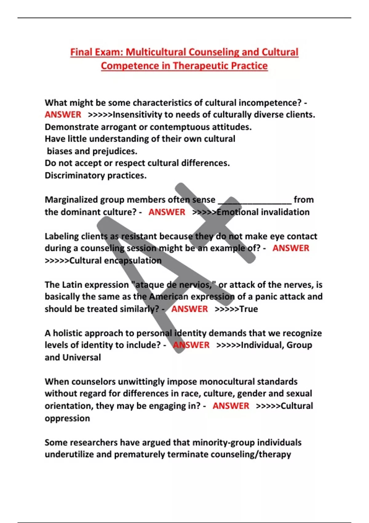Final Exam: Multicultural Counseling and Cultural